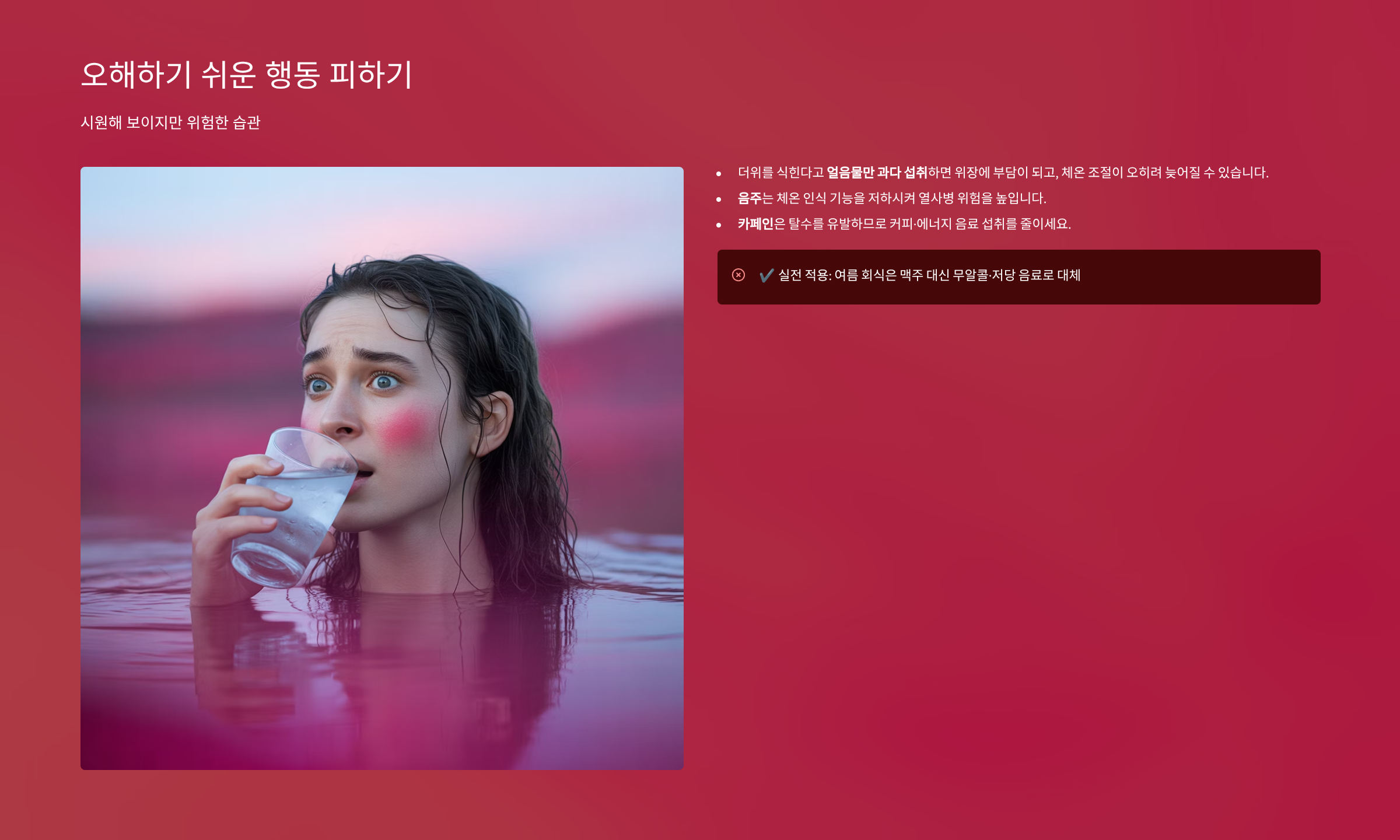 더위를 식힌다고 얼음물만 과다 섭취하면 위장에 부담이 되고, 체온 조절이 오히려 늦어질 수 있습니다. 음주는 체온 인식 기능을 저하시켜 열사병 위험을 높입니다. 카페인은 탈수를 유발하므로 커피·에너지 음료 섭취를 줄이세요.