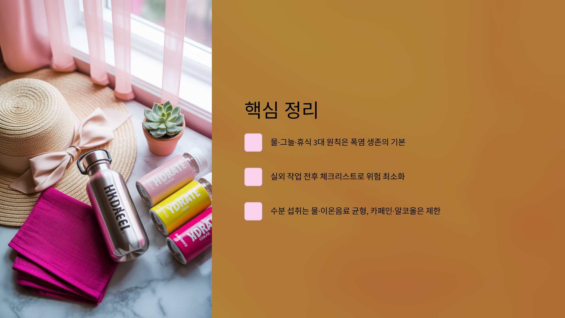 • 물·그늘·휴식 3대 원칙은 폭염 생존의 기본
