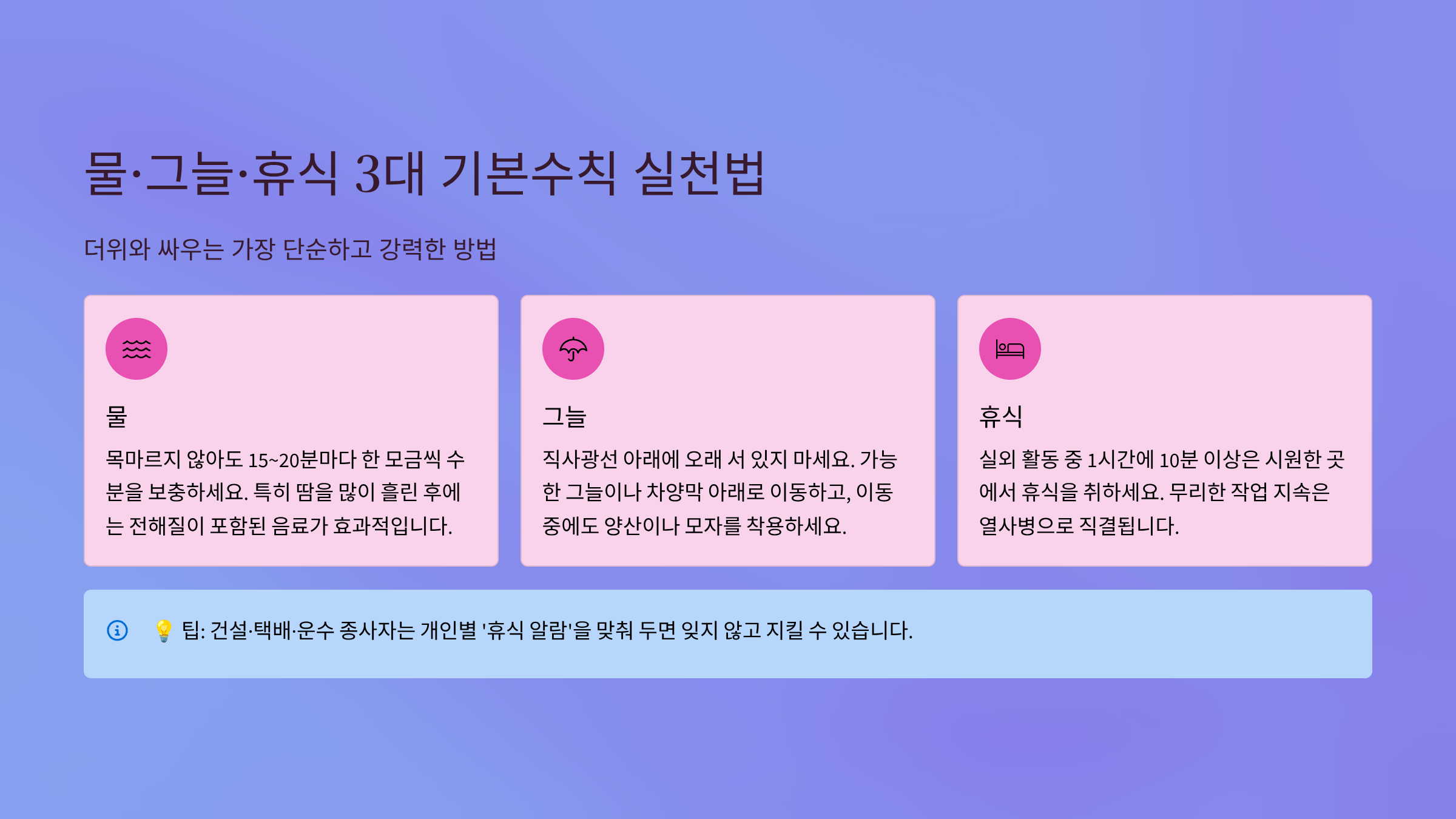 - 물·그늘·휴식 3대 원칙은 폭염 생존의 기본