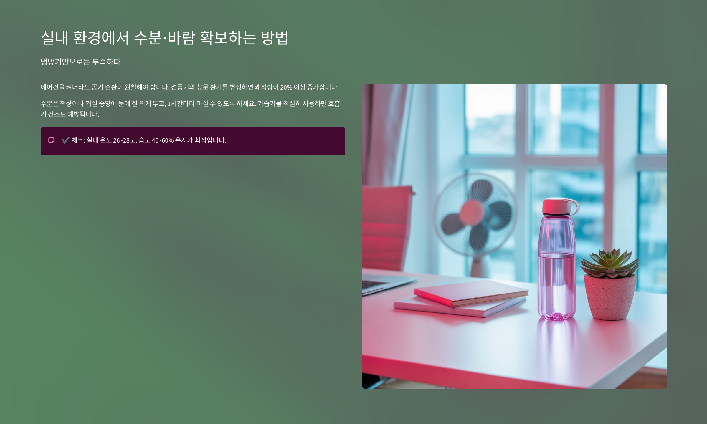 에어컨을 켜더라도 공기 순환이 원활해야 합니다. 선풍기와 창문 환기를 병행하면 쾌적함이 20% 이상 증가합니다. 수분은 책상이나 거실 중앙에 눈에 잘 띄게 두고, 1시간마다 마실 수 있도록 하세요. 가습기를 적절히 사용하면 호흡기 건조도 예방됩니다.