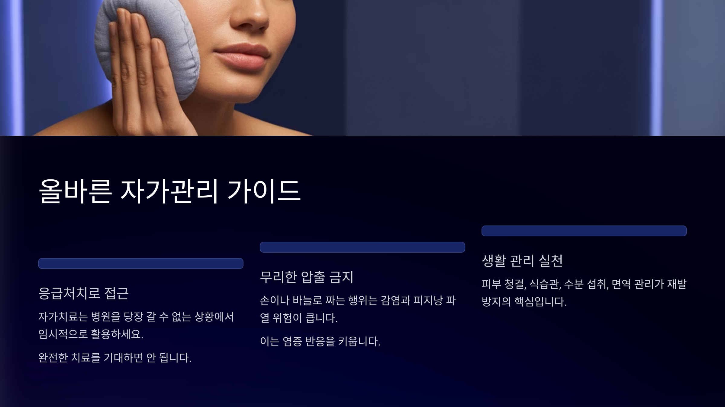 리뷰 분석 결과, 자가치료 후 "작아졌다", "사라진 것 같다"는 응답이 있더라도 2~3개월 내 재발하는 경우가 다수였습니다. 특히 면역력이 낮거나 피부에 잔손상이 많은 40대 이상 직장인에게는 자극적이거나 반복적인 자가치료가 오히려 피부 문제를 키울 수 있습니다.