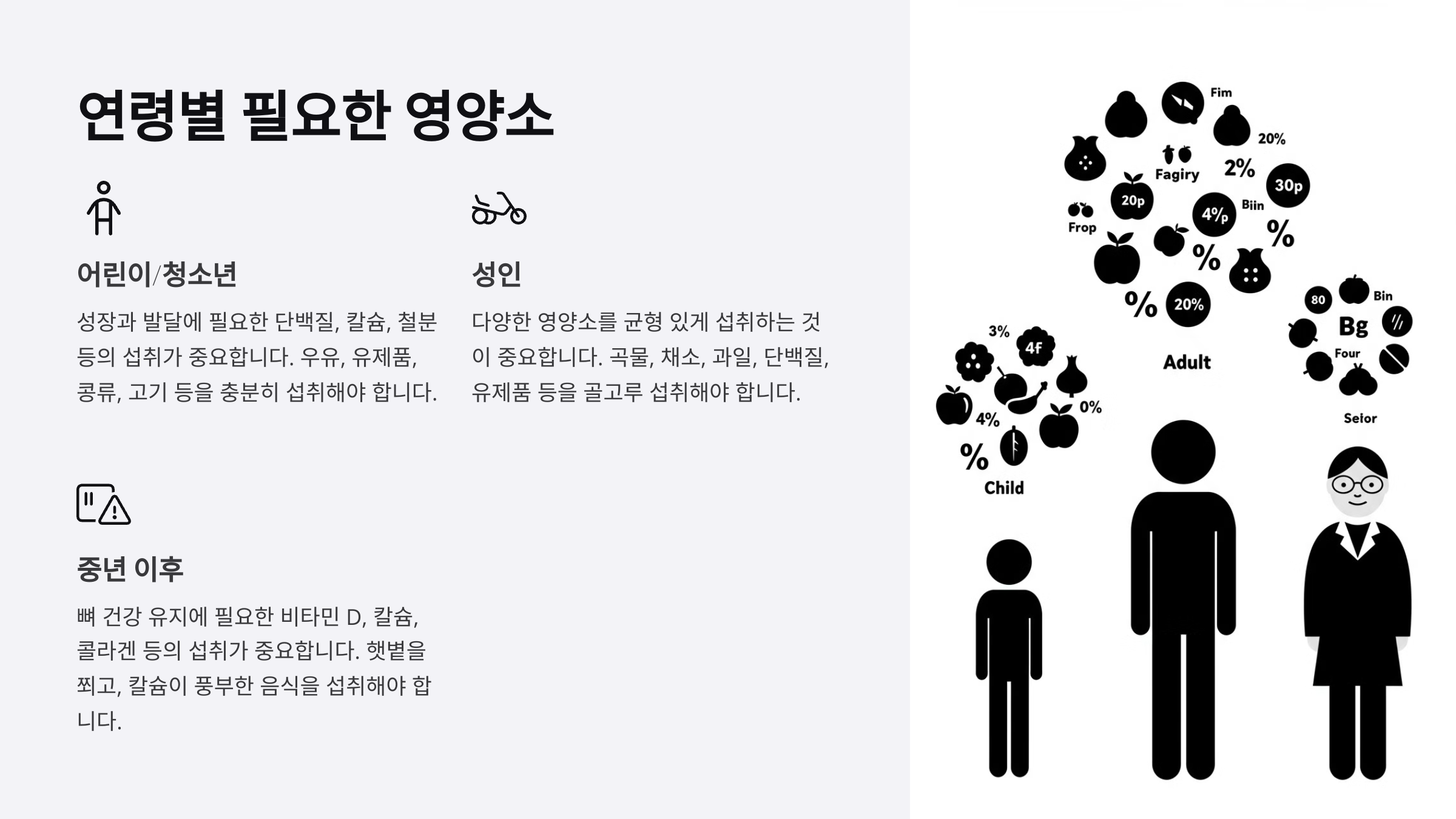 영양소는 우리 몸의 건강을 유지하는 데 필수적입니다. 연령대에 따라 필요한 영양소의 종류와 양이 다르므로, 각자의 상황에 맞는 영양소를 충분히 섭취하는 것이 중요합니다. 균형 잡힌 식사를 통해 건강한 삶을 유지하시기 바랍니다.