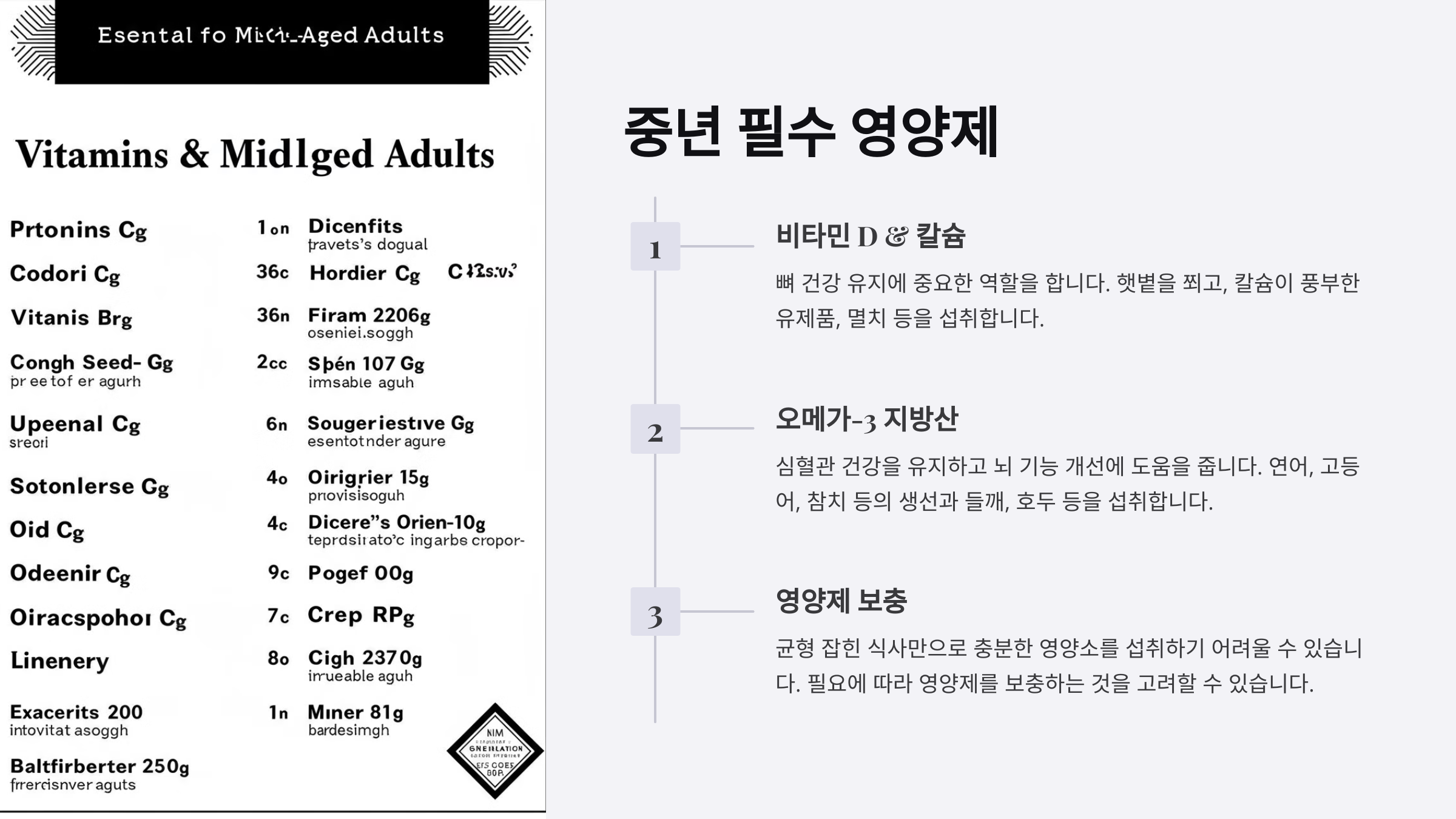 중년 이후에는 신체의 변화로 인해 특정 영양소의 섭취가 더욱 중요해집니다. 비타민 D와 칼슘은 뼈 건강을 유지하는 데 필수적입니다. 오메가-3 지방산은 심혈관 건강에 도움을 줄 수 있습니다.