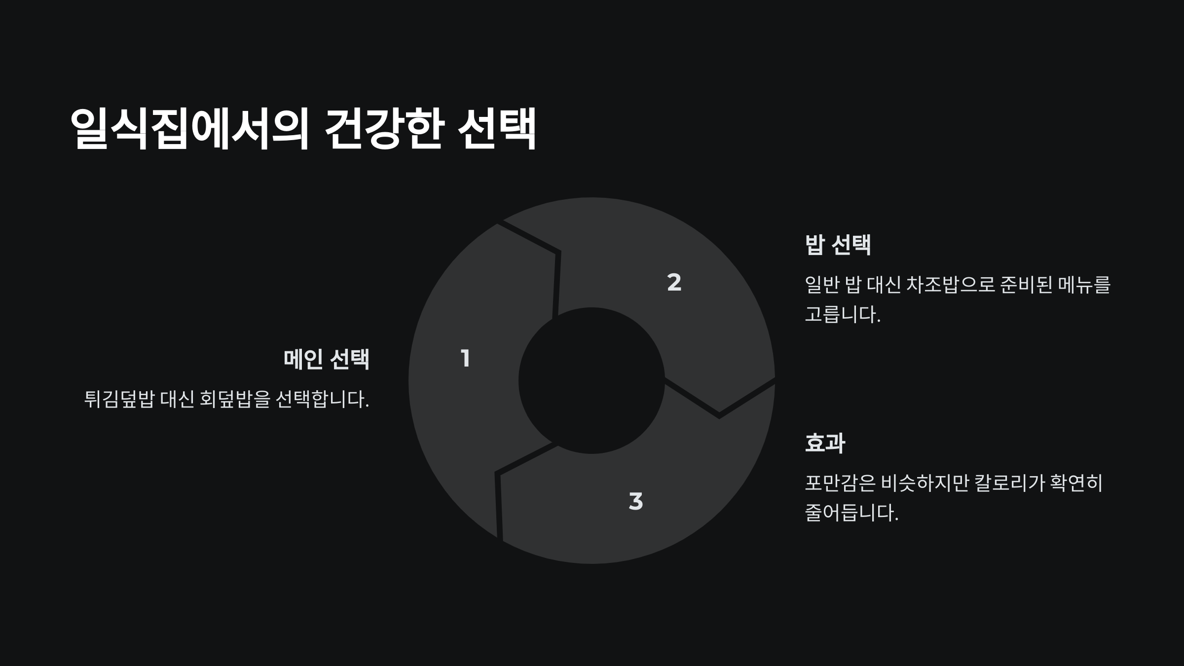 - 외식 시 건강한 대체 메뉴 선택으로 평균 35% 칼로리 감소 효과