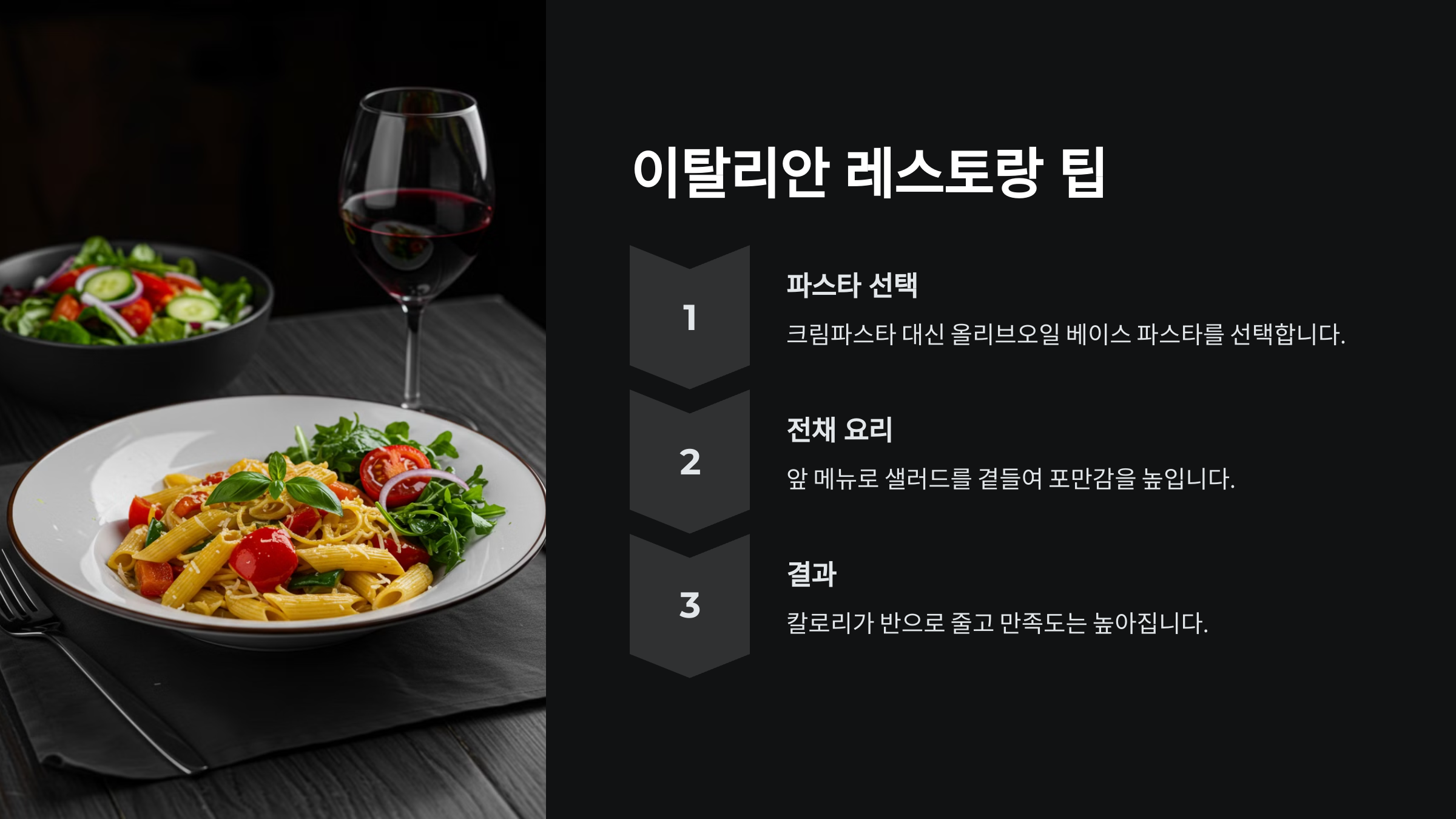 리뷰 3: "이탈리안 레스토랑에서는 크림파스타 대신 올리브오일 베이스 파스타를 선택하고, 앞 메뉴로 샐러드를 곁들이니 포만감도 좋고 칼로리도 반으로 줄었어요."