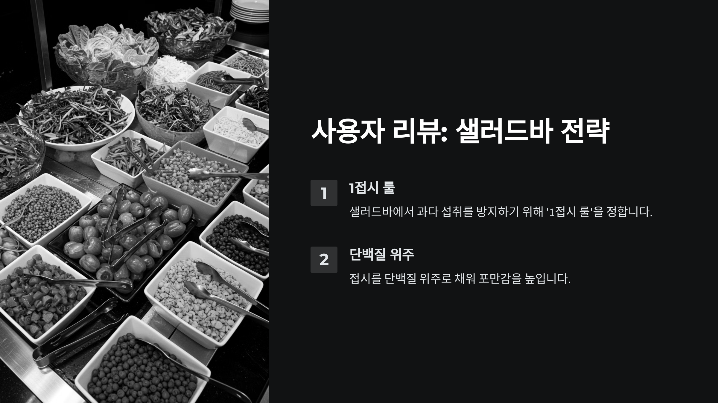 리뷰 1: "샐러드바만 가면 자칫 과다 섭취할 수 있어요. 하지만 '1 접시 룰'을 정해두고 단백질 위주로 채우니 확실히