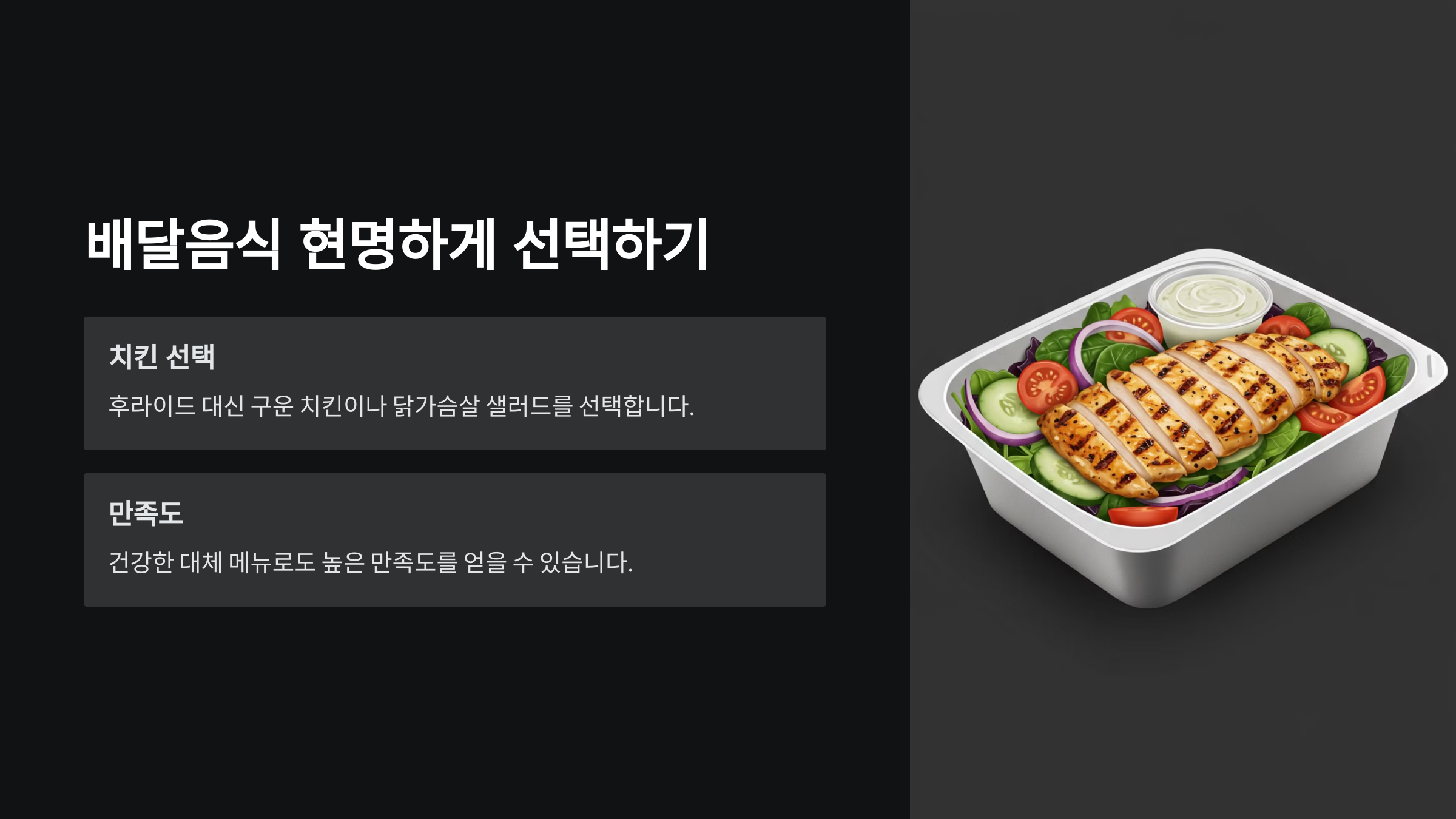리뷰 4: "배달음식도 현명하게 선택할 수 있어요. 치킨은 후라이드 대신 구운 치킨이나 닭가슴살 샐러드로 대체하니 만족도가 높았습니다."
