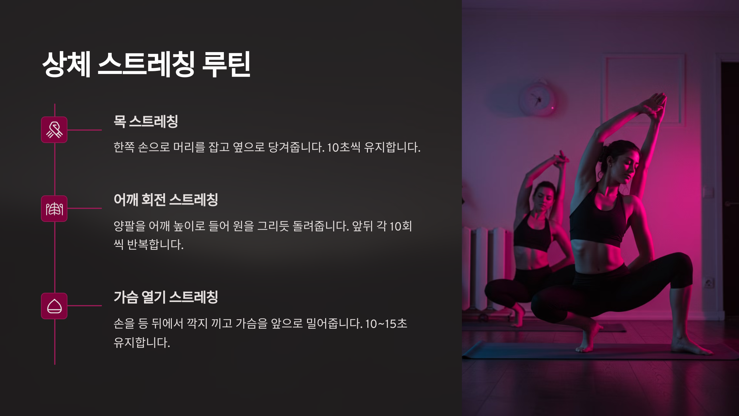 - 반대쪽도 동일하게 진행하며, 10초씩 유지합니다.