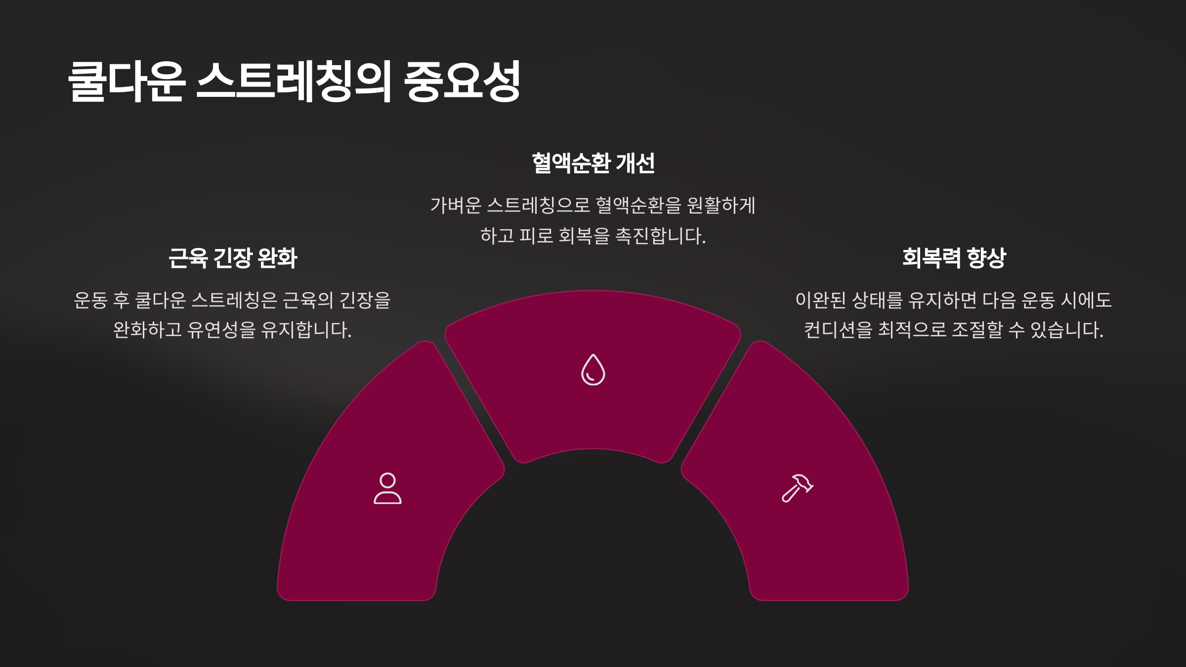 운동 후 쿨다운 스트레칭을 하면 근육의 긴장을 완화하고 유연성을 유지하는 데 도움이 됩니다. 이완된 상태를 유지하면 다음 운동 시에도 컨디션을 최적으로 조절할 수 있습니다.