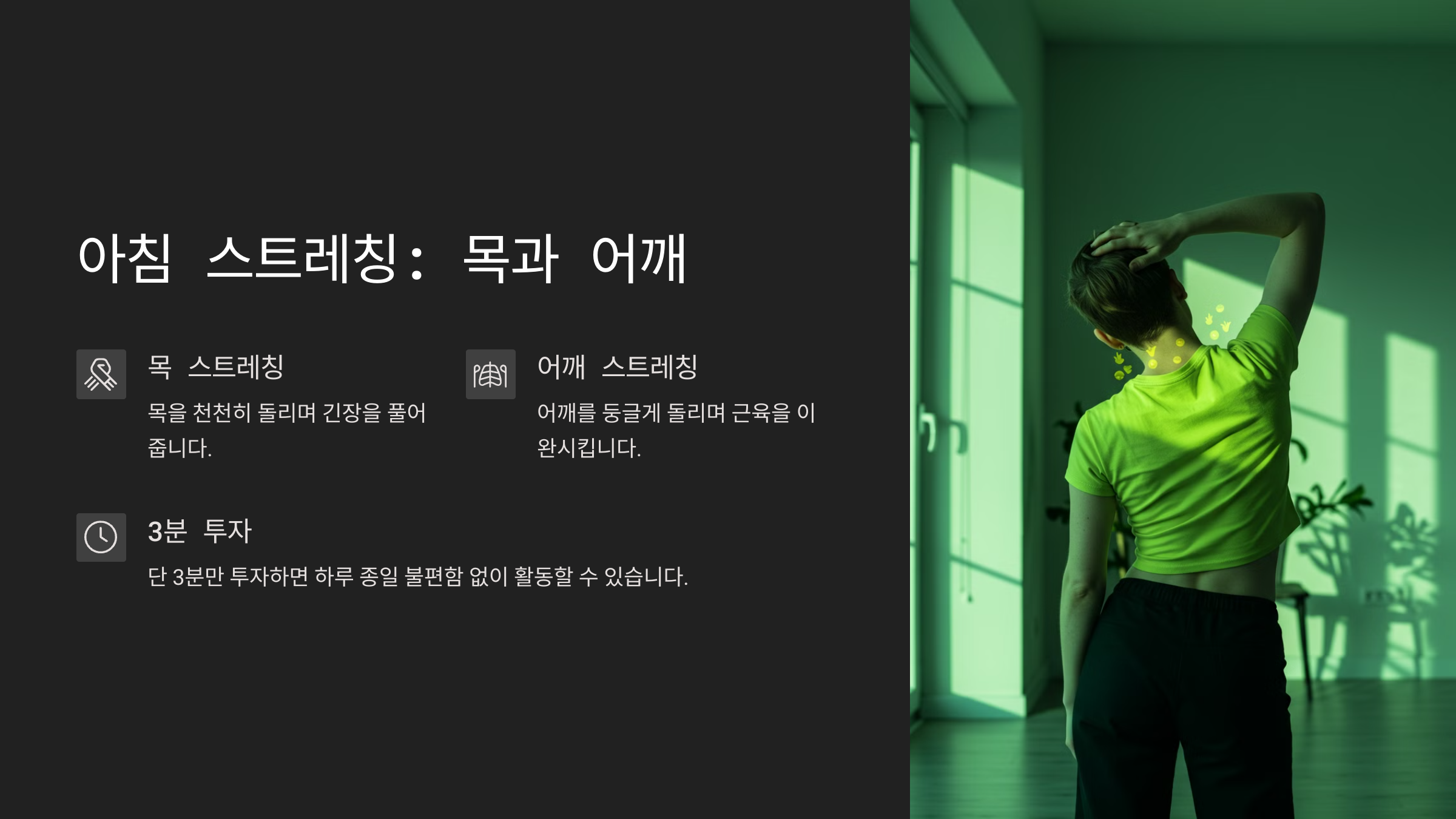 아침에 일어나서 가장 먼저 느끼는 불편함 중 하나는 목과 어깨의 뻣뻣함입니다. 아침에 스트레칭을 통해 경직된 부위를 풀어주면 하루 종일 불편함 없이 활동할 수 있습니다. 목을 천천히 돌리며 긴장을 풀고, 어깨를 둥글게 돌리면서 근육을 이완시키세요. 이 간단한 스트레칭만으로도 하루 종일 신체적 불편함을 줄일 수 있습니다.