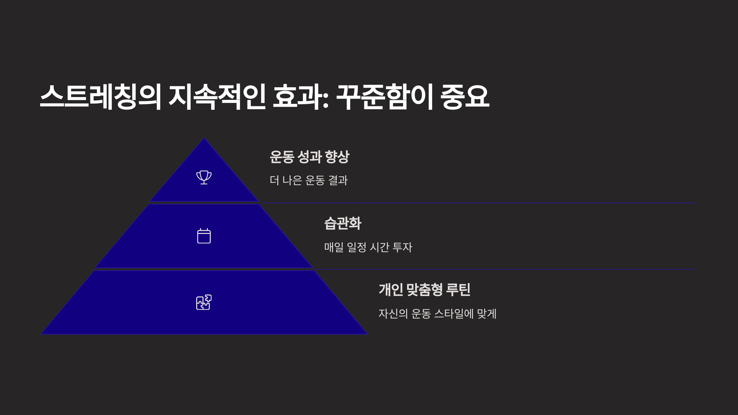 스트레칭을 습관으로 만드는 것이 중요합니다. 매일 일정 시간을 스트레칭에 투자하세요! 5분이라도 매일 스트레칭을 하면, 몸의 유연성뿐 아니라 회복 속도도 빨라집니다.