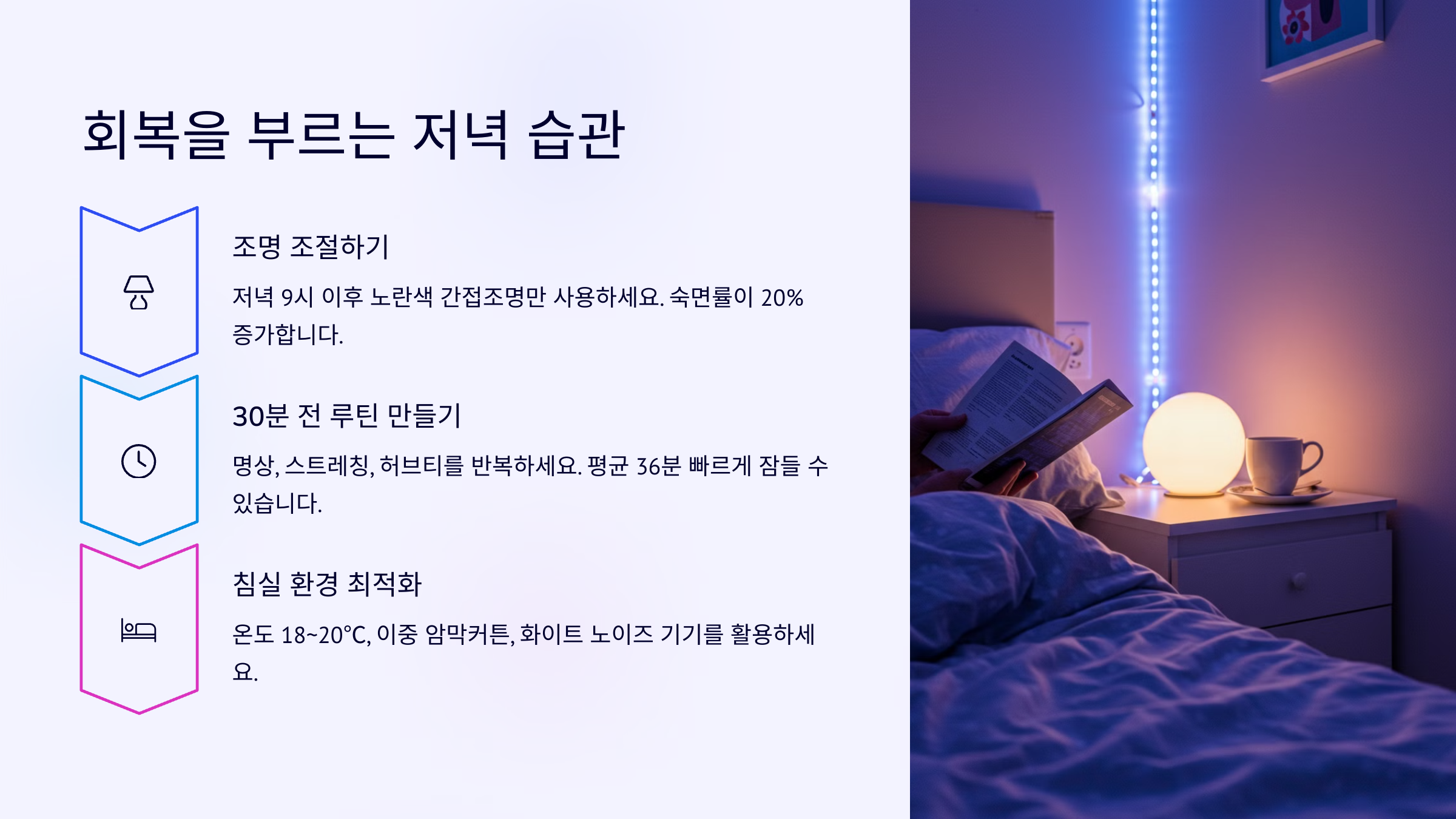 멜라토닌 분비를 유도하려면 조명부터 바꾸는 것이 좋습니다. 저녁 9시 이후에는 노란색 계열의 간접조명만 켜두고, 스마트폰은 '야간 모드'로 전환하세요. 실제로 한 수면 코칭 앱 사용자 리뷰에선 “수면 전 간접조명 사용만으로도 숙면율이 20% 증가했다”라고 보고했습니다.
