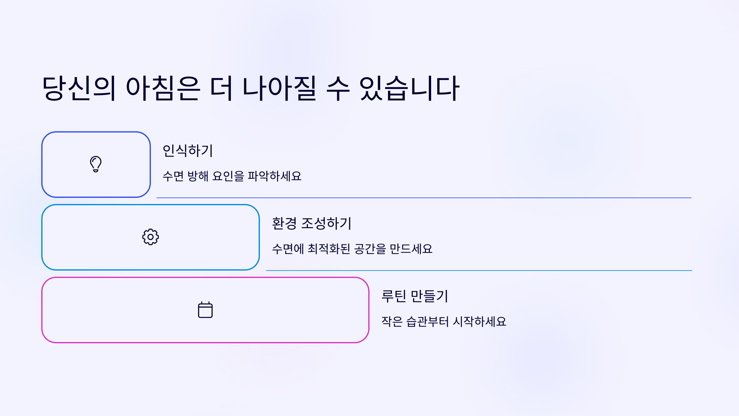 아침이 무겁게 느껴지는 건 단순히 잠을 못 자서가 아닙니다. 우리 몸과 뇌는 반복된 수면 환경 속에서 조금씩 망가져가고 있습니다. 하지만 오늘부터 작은 루틴 하나만 바꿔도, 삶의 질은 충분히 달라질 수 있습니다. 가족을 위해, 나를 위해, 하루의 시작을 가볍게 만들어보세요. 당신의 아침은 더 나아질 수 있습니다