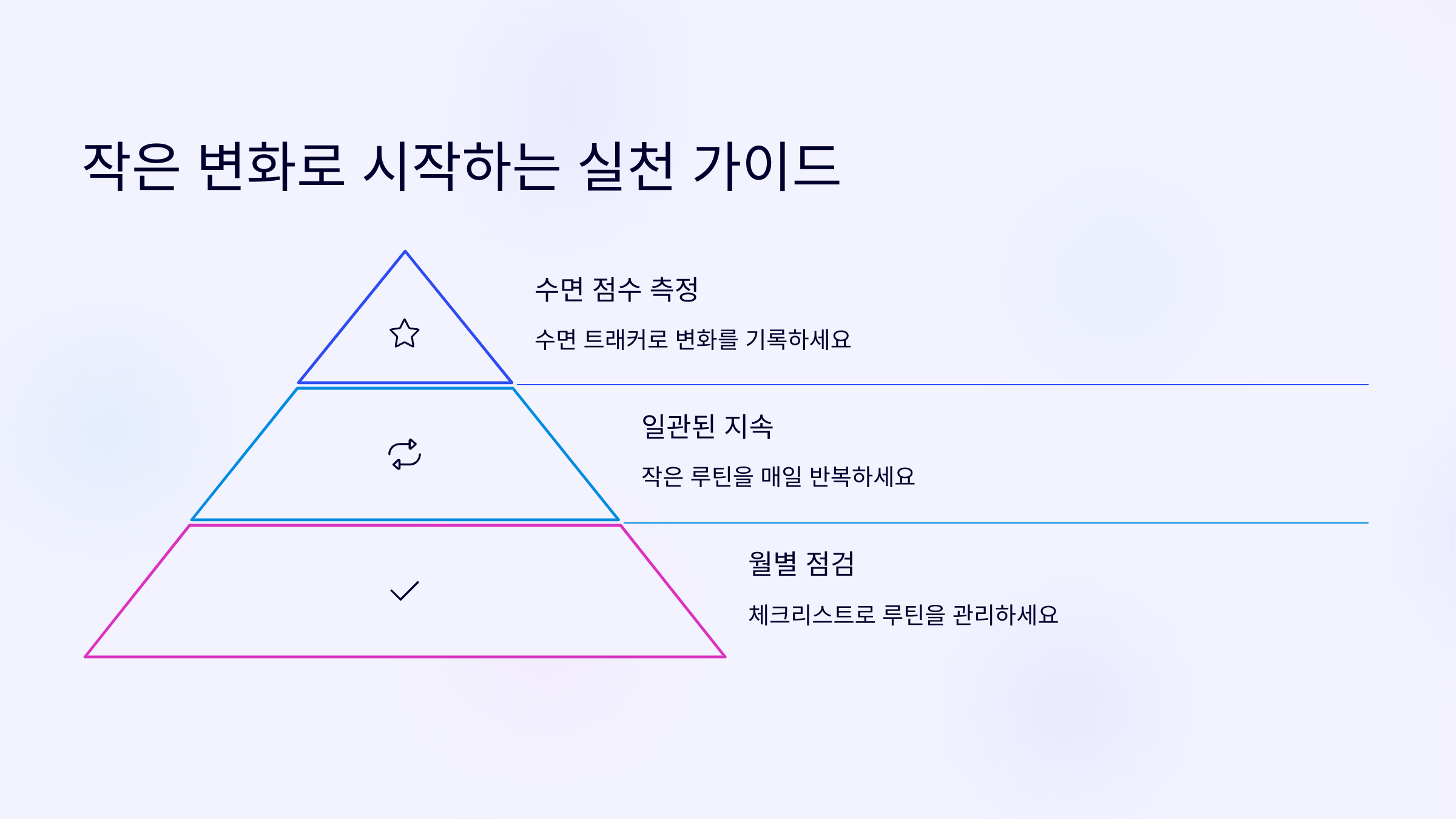 매달 수면 루틴을 점검하는 체크리스트를 만들면 루틴 유지에 도움이 됩니다. 다음 달 목표를 설정하고, 1~2가지씩만 바꿔보는 것이 좋습니다.