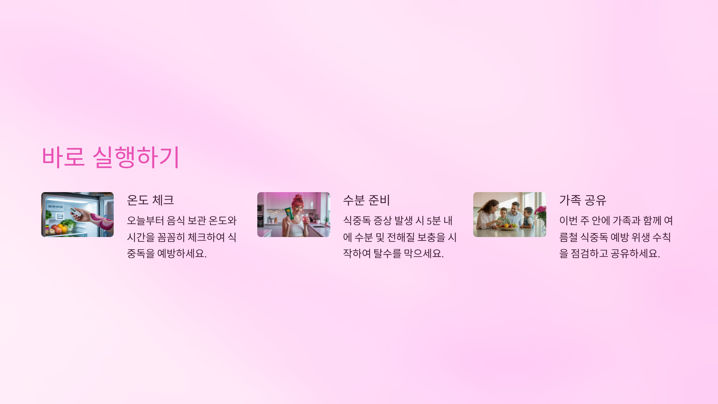 여름철 식중독 초기 대응부터 예방, 병원 방문 시기까지 6단계로 실전 대응법을 바로 적용할 수 있습니다.
