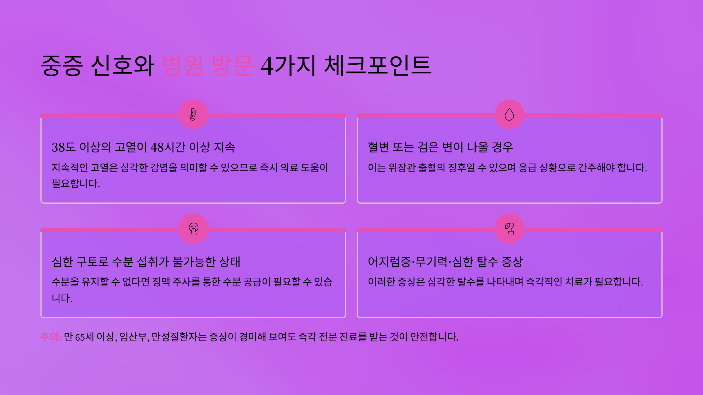 아래 4가지 신호가 나타나면 바로 병원을 방문해야 합니다. 첫째, 38도 이상의 고열이 48시간 이상 지속될 때, 둘째, 혈변 또는 검은 변이 나올 경우, 셋째, 심한 구토로 수분 섭취가 불가능한 상태, 넷째, 어지럼증·무기력·심한 탈수 증상이 동반될 때입니다. 특히 만 65세 이상, 임산부, 만성질환자라면 이런 증상이 경미해 보여도 즉각 전문 진료를 받는 것이 안전합니다. 저도 가족 중 한 분이 혈변 증상을 보였을 때 지체 없이 병원에 데려가 큰 합병증을 막을 수 있었습니다.