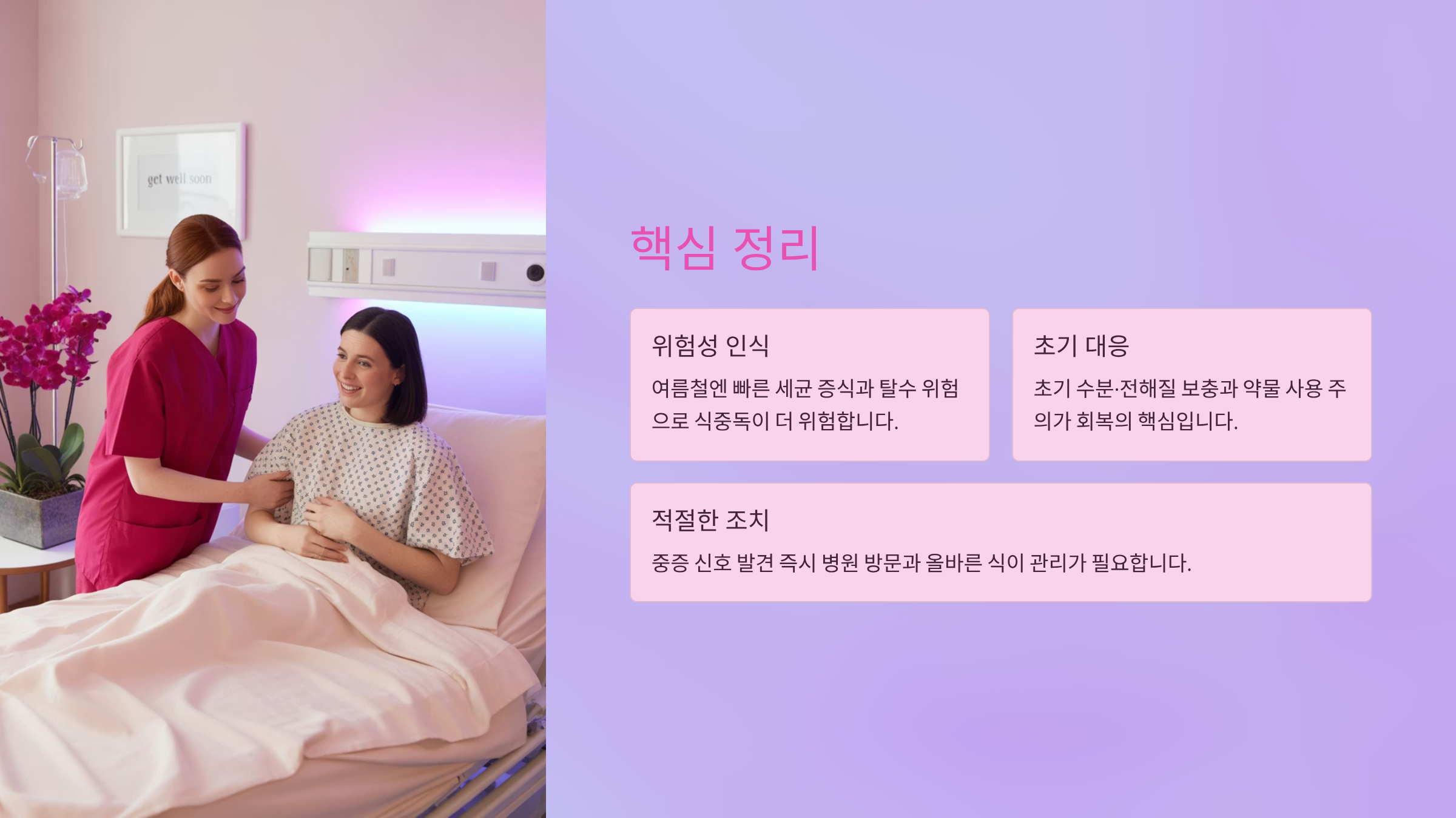 - 여름철엔 빠른 세균 증식과 탈수 위험으로 식중독이 더 위험하다.