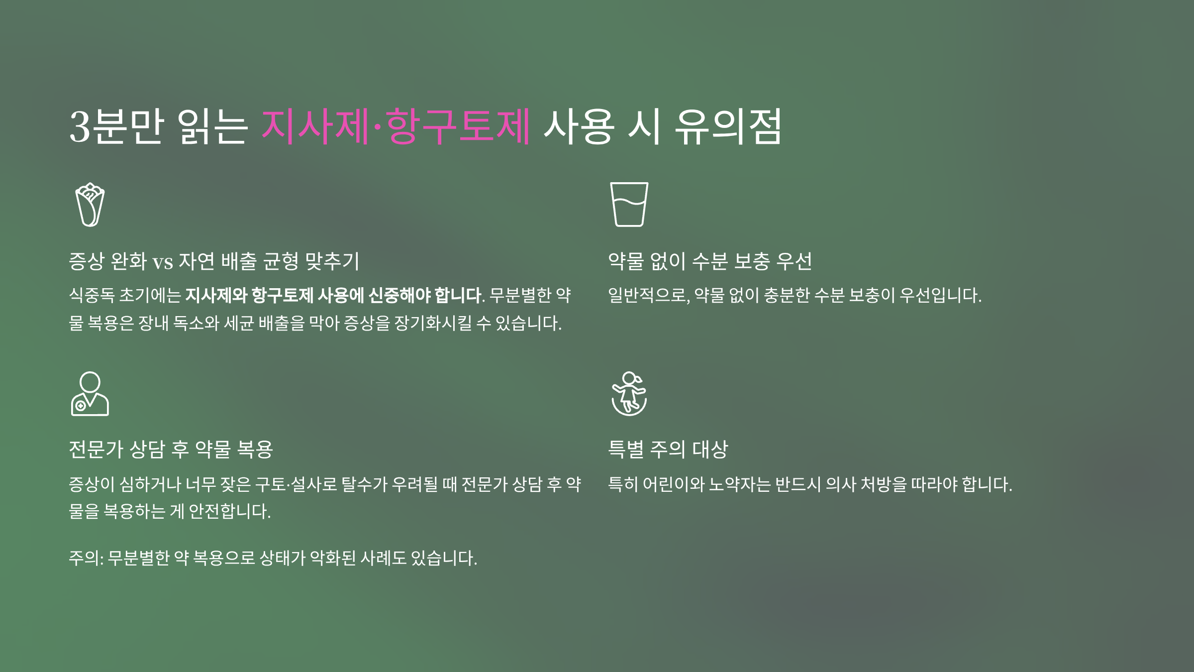 식중독 초기에는 지사제와 항구토제 사용에 신중해야 합니다. 무분별한 약물 복용은 장내 독소와 세균 배출을 막아 증상을 장기화시킬 수 있습니다. 일반적으로, 1단계에서는 약물 없이 충분한 수분 보충이 우선이고, 2단계에서 증상이 심하거나 너무 잦은 구토·설사로 탈수가 우려될 때 전문가 상담 후 약물을 복용하는 게 안전합니다. 3단계로, 특히 어린이와 노약자는 반드시 의사 처방을 따라야 하며, 제가 아는 환자 중 무분별한 약 복용으로 상태가 악화된 사례도 있습니다.