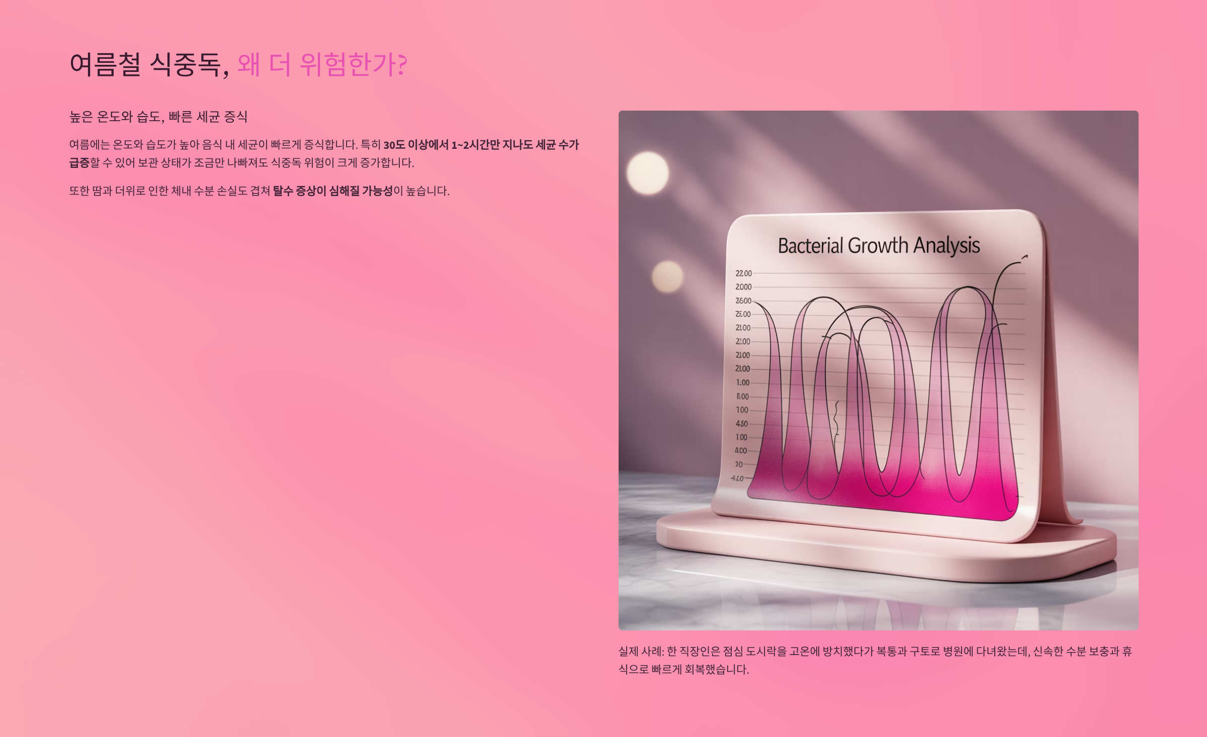- 여름철엔 빠른 세균 증식과 탈수 위험으로 식중독이 더 위험하다.