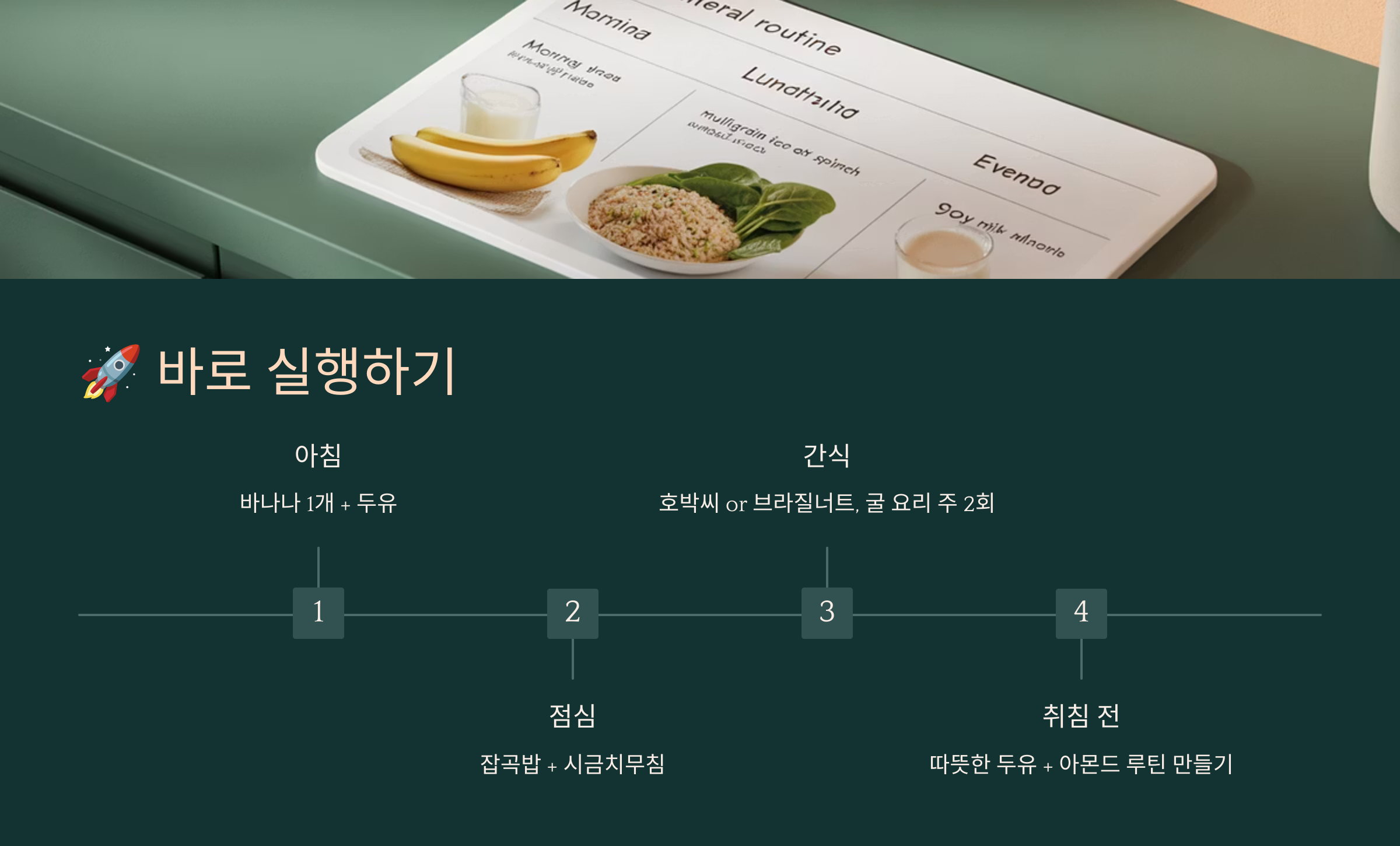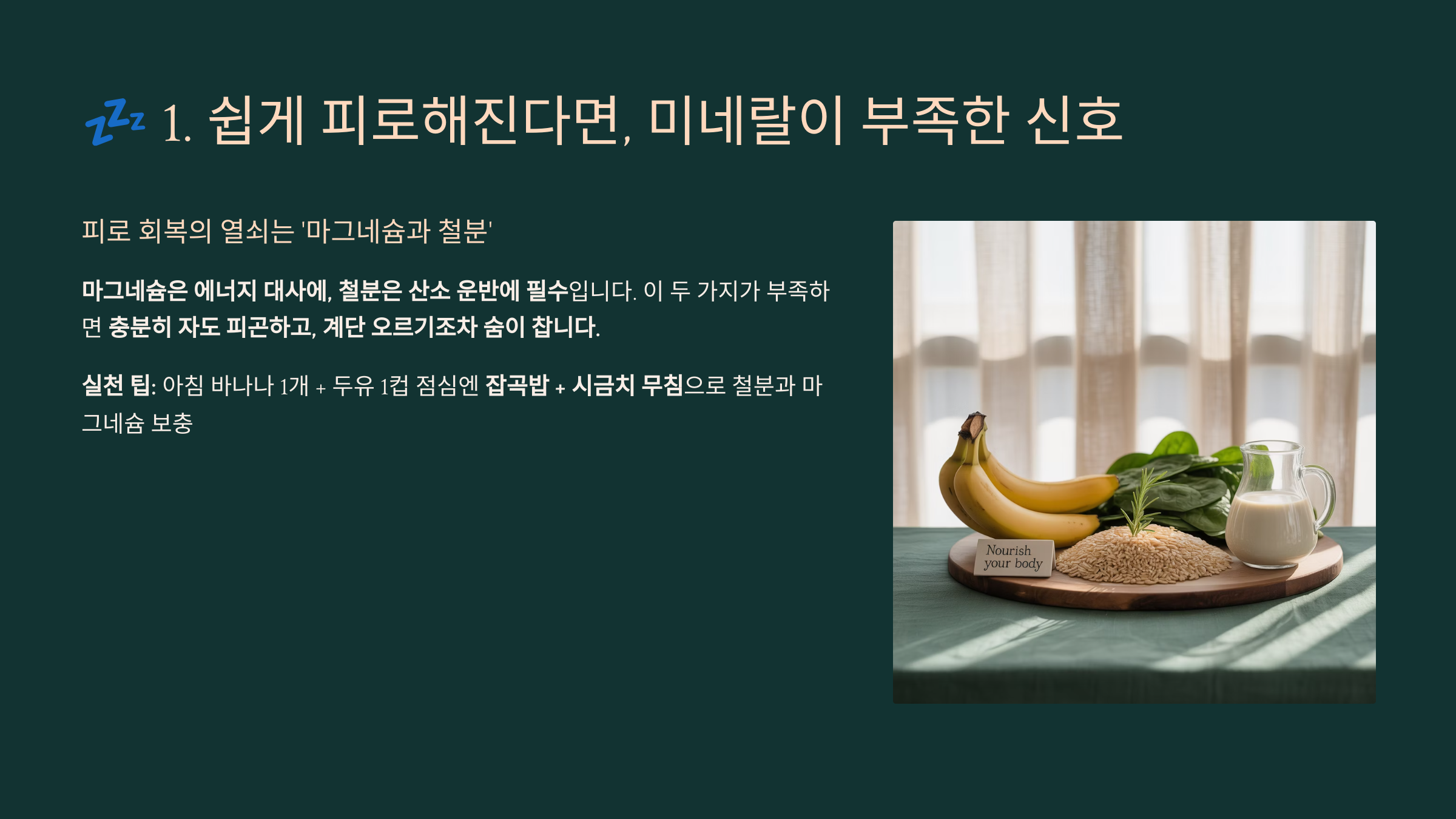 > 실천 팁: 아침 바나나 1개 + 두유 1컵 점심엔 **잡곡밥 + 시금치 무침**으로 철분과 마그네슘 보충