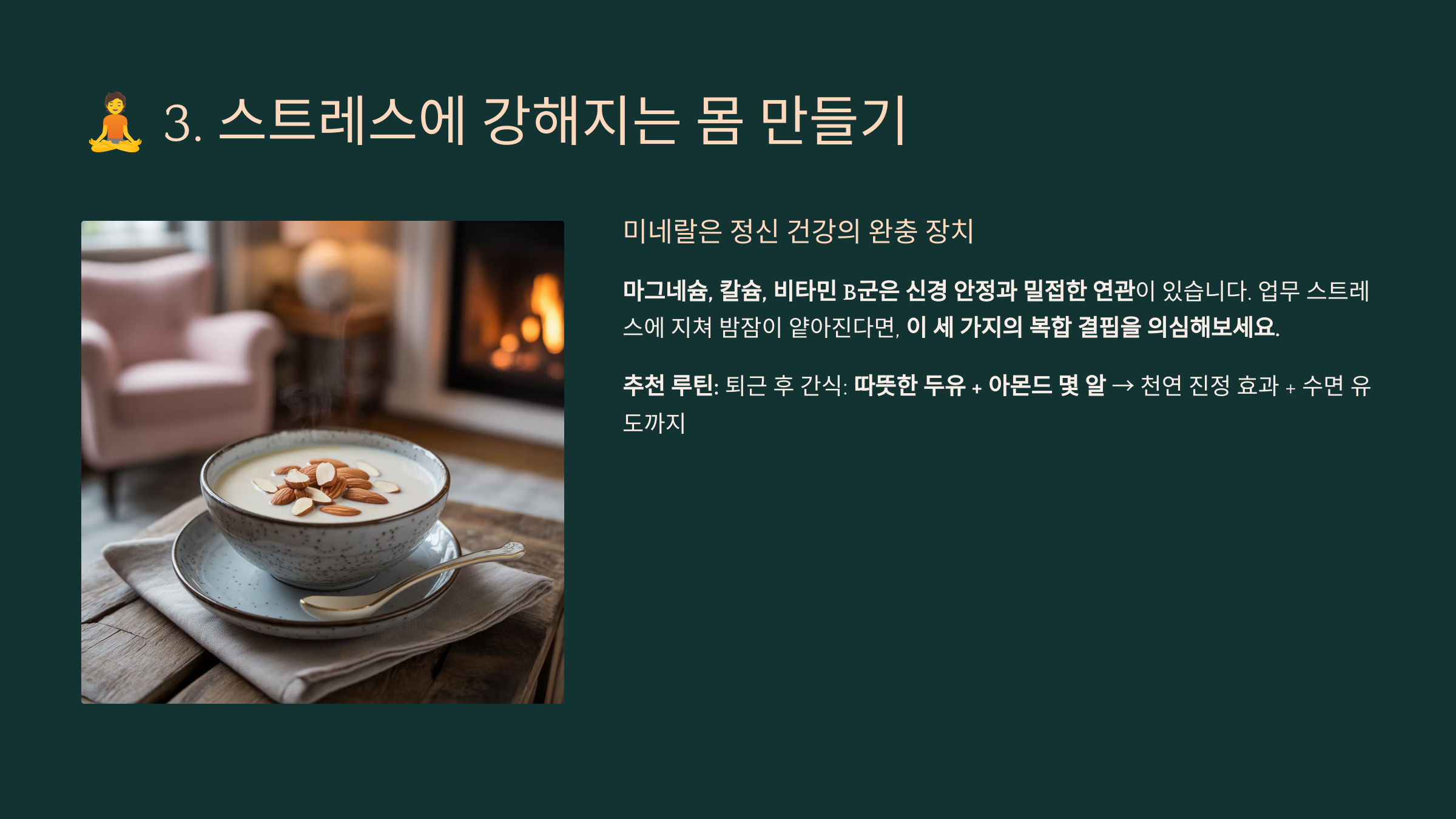 > 추천 루틴: 퇴근 후 간식: **따뜻한 두유 + 아몬드 몇 알** → 천연 진정 효과 + 수면 유도까지