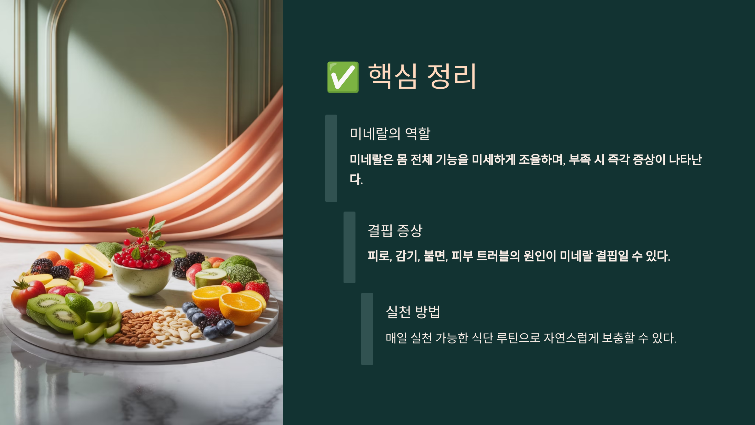 - 미네랄은 몸 전체 기능을 미세하게 조율하며, 부족 시 즉각 증상이 나타난다.