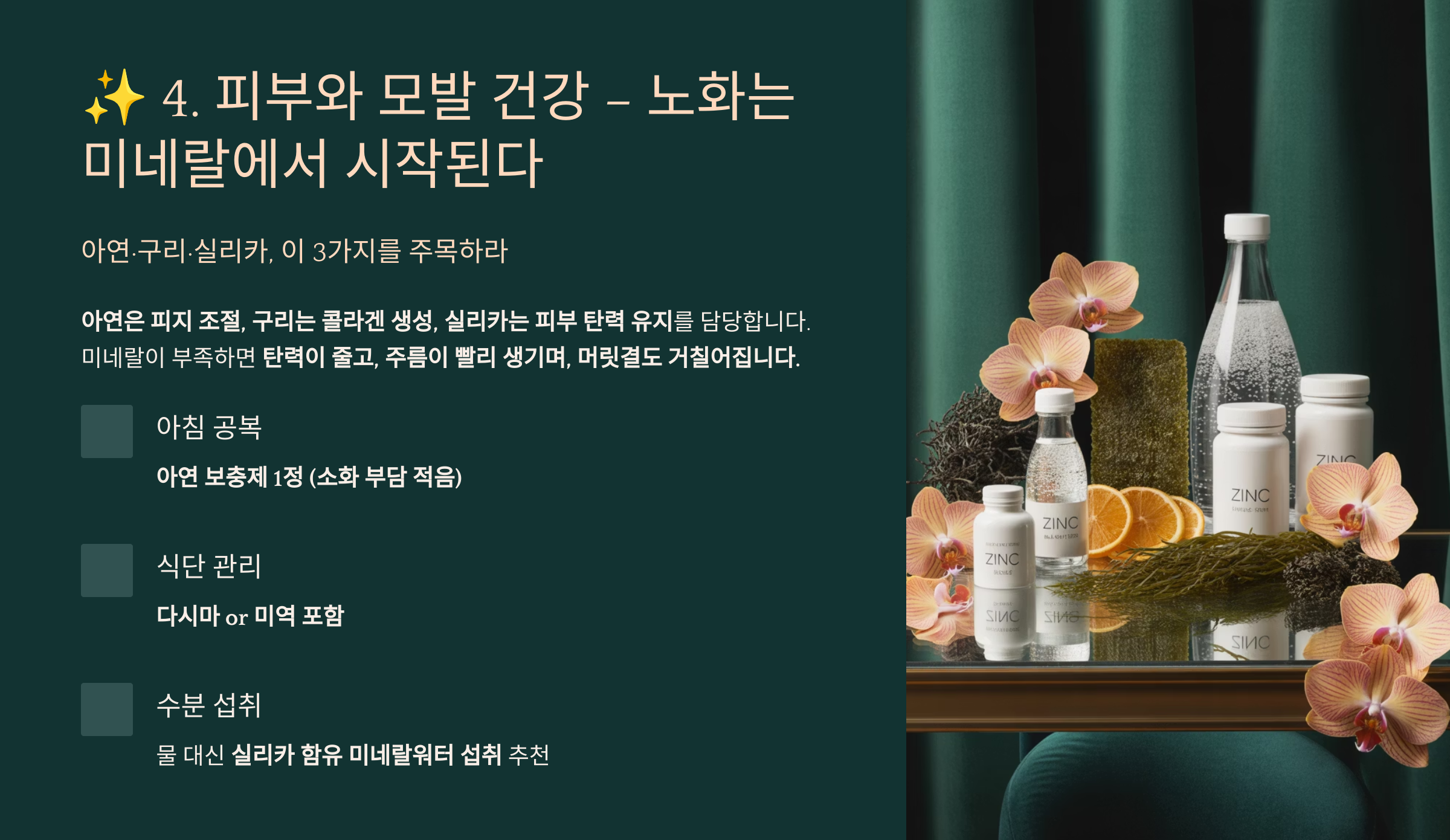 아연은 피지 조절, 구리는 콜라겐 생성, 실리카는 피부 탄력 유지를 담당합니다. 미네랄이 부족하면 **탄력이 줄고, 주름이 빨리 생기며, 머릿결도 거칠어집니다.**