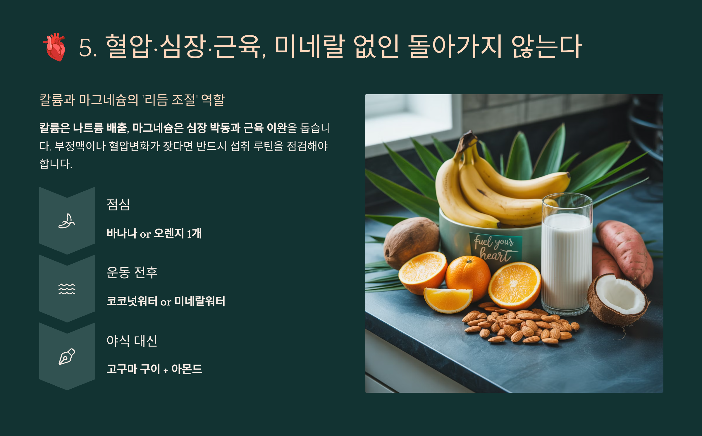 칼륨은 나트륨 배출, 마그네슘은 심장 박동과 근육 이완을 돕습니다. 부정맥이나 혈압변화가 잦다면 반드시 섭취 루틴을 점검해야 합니다.
