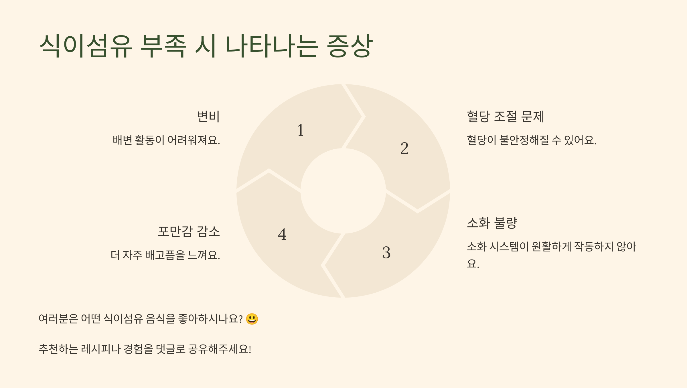 식이섬유는 장 건강, 변비 예방, 혈당 조절, 다이어트 등에 중요한 역할을 해요.