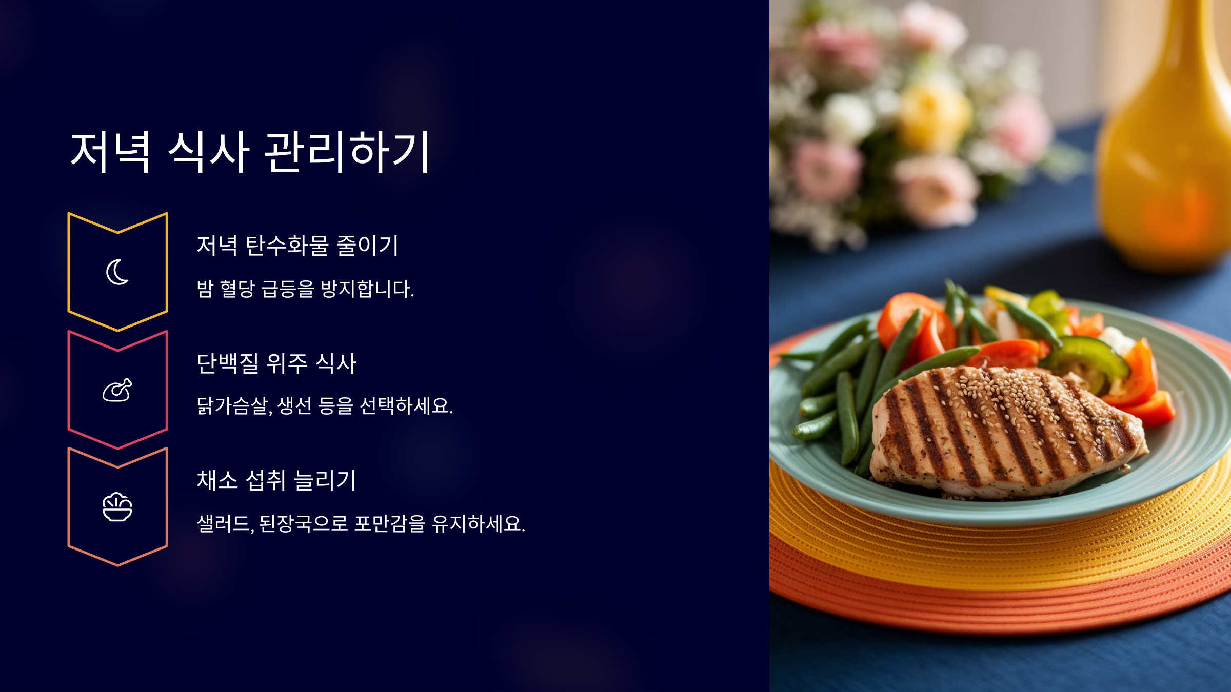 실천 방법: 저녁 식사에서 탄수화물 섭취를 줄이고, 대신 단백질과 채소 위주의 식단을 선택하세요. 예를 들어, 구운 닭가슴살과 샐러드, 된장국 등을 섭취하는 것이 좋습니다.