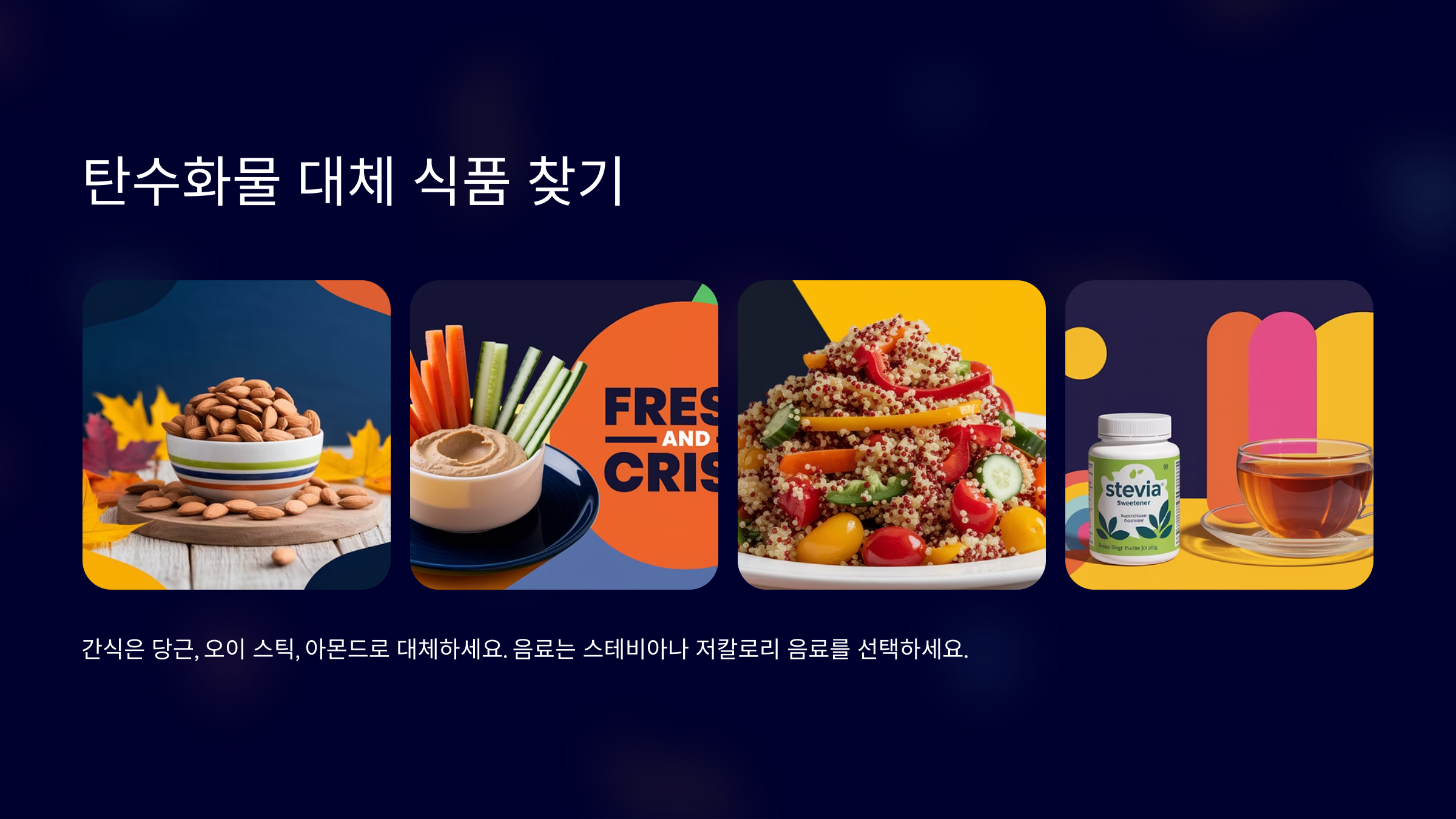 실천 방법: 간식으로는 당근이나 오이 스틱, 아몬드 등을 선택하고, 음료는 설탕 대신 스테비아나 저칼로리 음료로 대체해 보세요. 이렇게 점진적으로 탄수화물을 줄여 나가면, 중독을 극복하는 데 큰 도움이 됩니다.