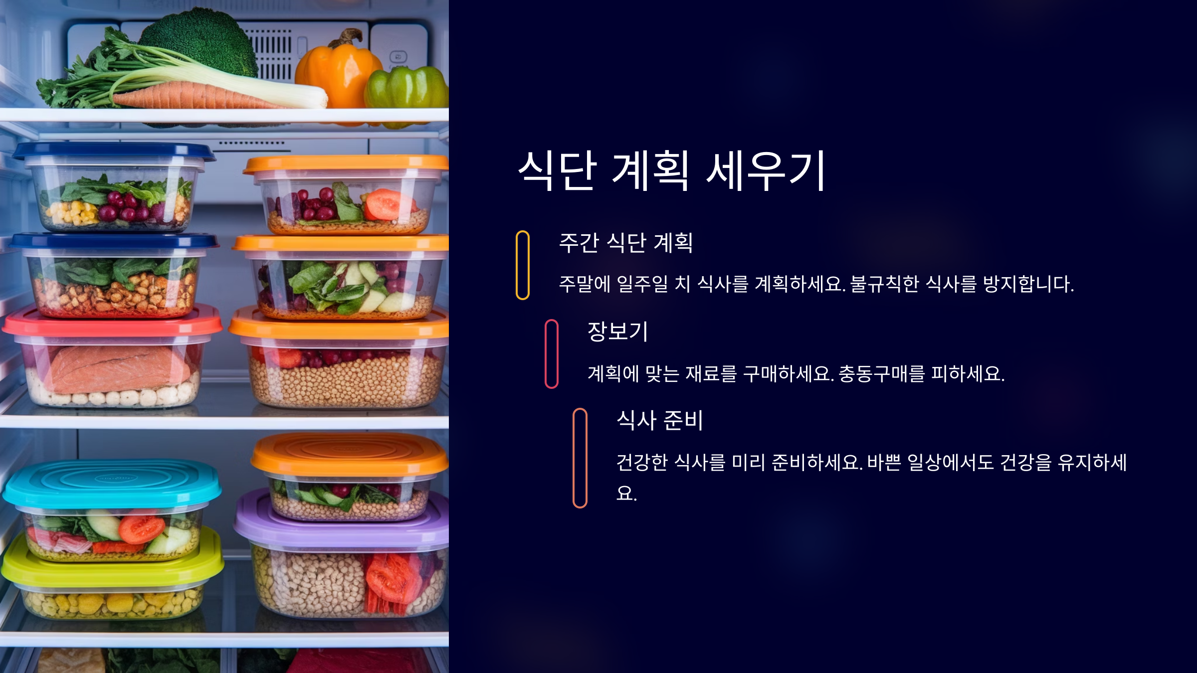 실천 방법: 주말에 주간 식단을 계획하고, 장을 보고 식사를 준비합니다. 건강한 저녁을 미리 준비해 두고, 바쁜 직장 생활 중에도 빠르고 간편하게 먹을 수 있도록 준비하세요.