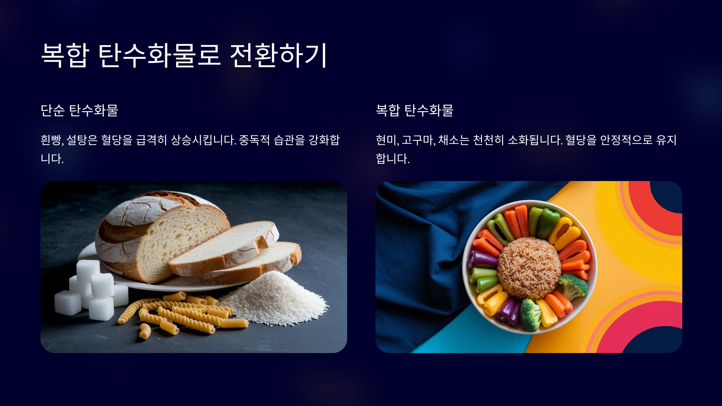 실천 방법: 매 끼니에 현미, 고구마, 콩류 등을 섭취하고, 가능한 한 정제된 탄수화물은 피하도록 합니다. 또한, 채소를 충분히 포함시켜 식사에 균형을 맞추는 것이 중요합니다.