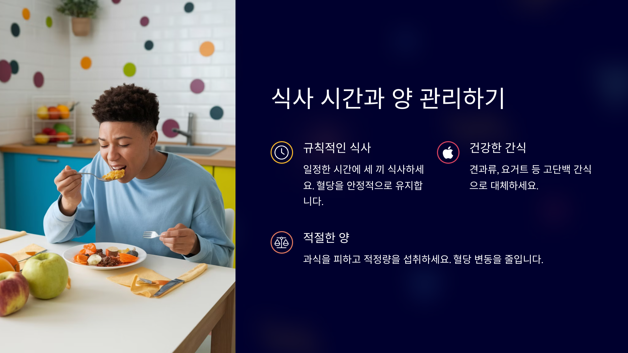 실천 방법: 하루 세끼를 일정한 시간에 먹고, 간식은 고단백 음식(예: 견과류, 요구르트 등)으로 대체해 보세요. 배가 고프지 않더라도, 식사 시간에 맞춰 먹는 습관을 들이면 과도한 탄수화물 섭취를 예방할 수 있습니다.