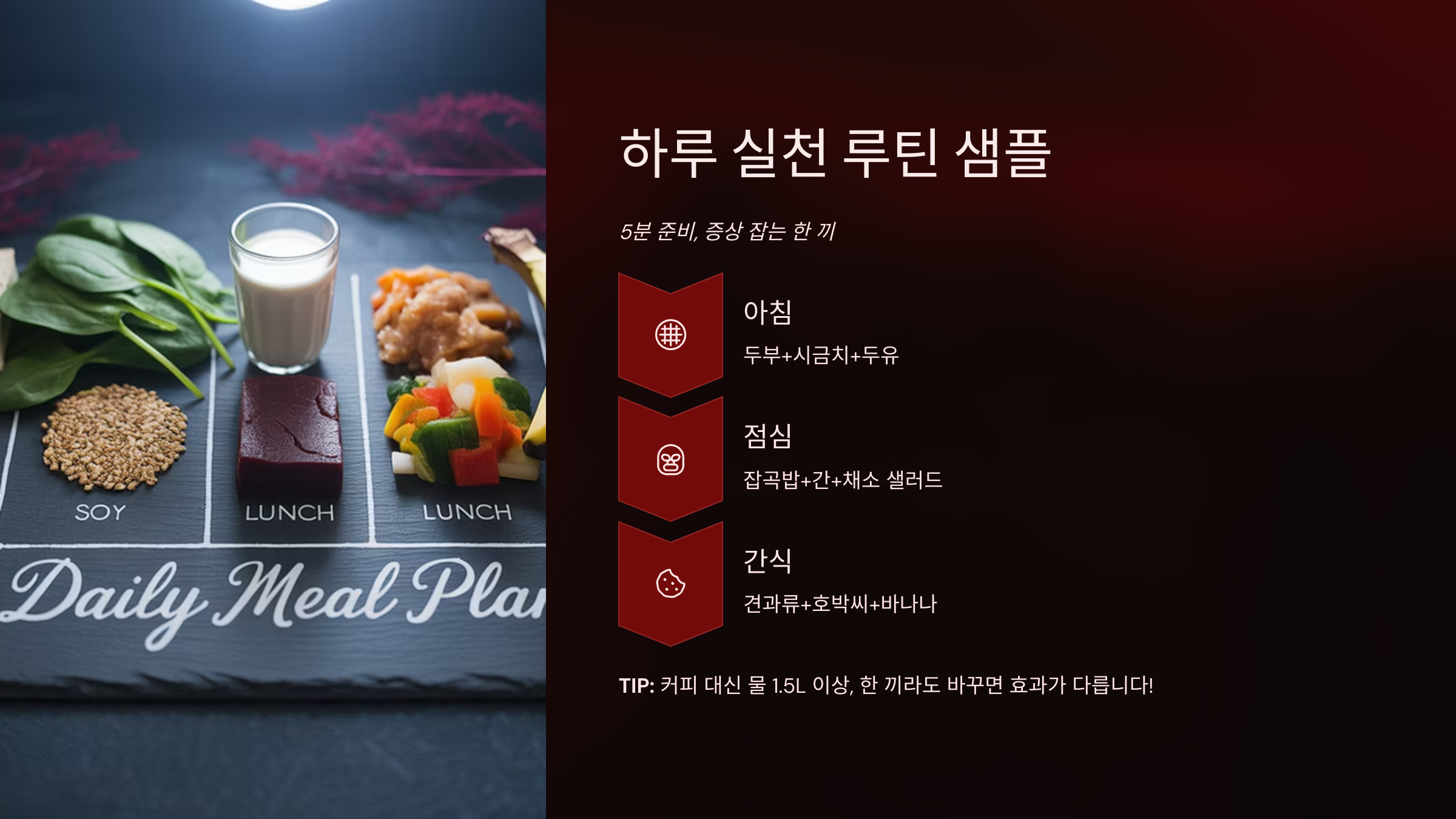 > TIP: 커피 대신 물 1.5L 이상, 한 끼라도 바꾸면 효과가 다릅니다!