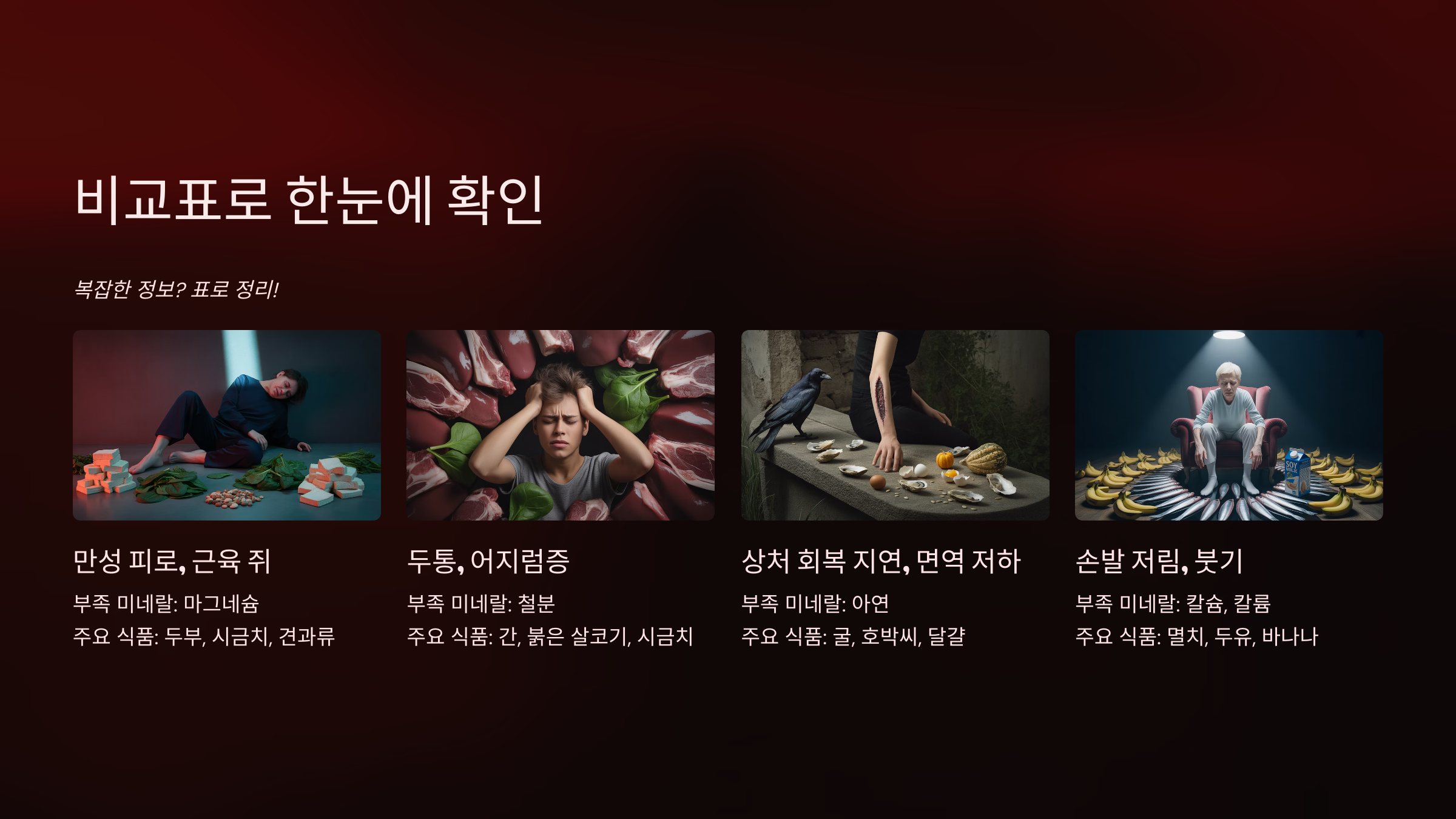 • ✔️ **만성 피로·근육 쥐** → 마그네슘: 두부, 시금치, 견과류