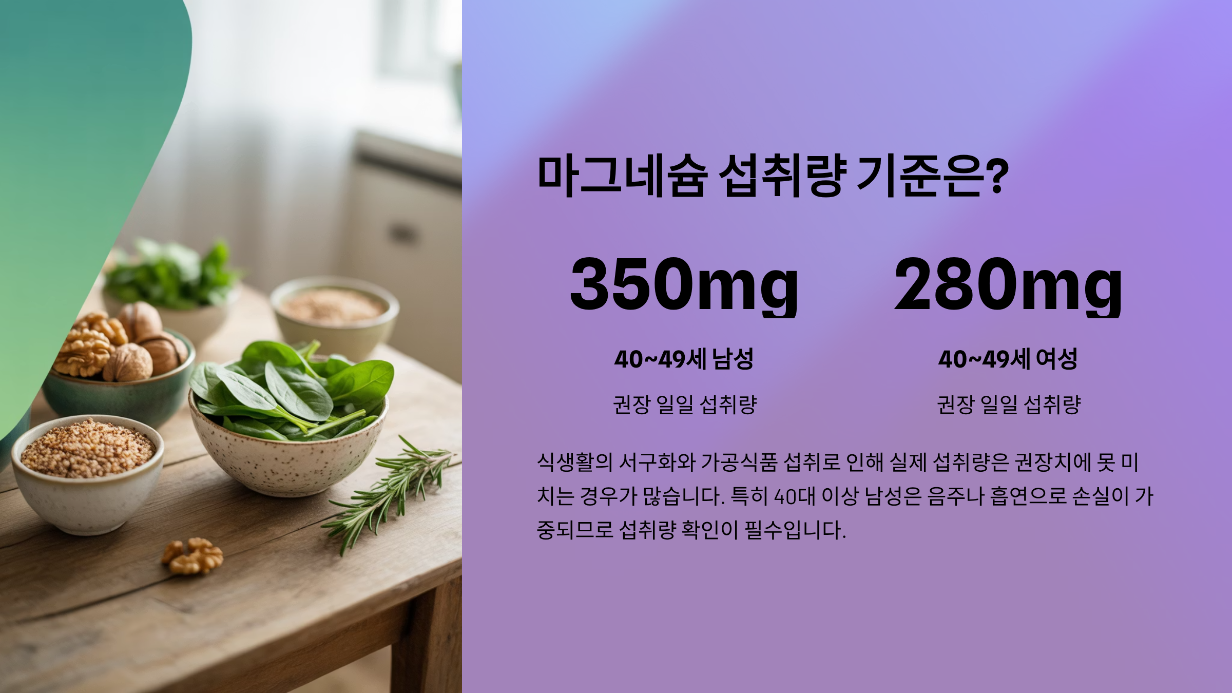 국내 기준으로 성인 남성은 350mg, 여성은 280mg의 마그네슘 섭취가 권장됩니다. 하지만 식생활의 서구화와 가공식품 섭취로 인해 실제 섭취량은 권장치에 못 미치는 경우가 많습니다. 특히 40대 이상 남성은 음주나 흡연으로 손실이 가중되므로 섭취량 확인이 필수입니다.