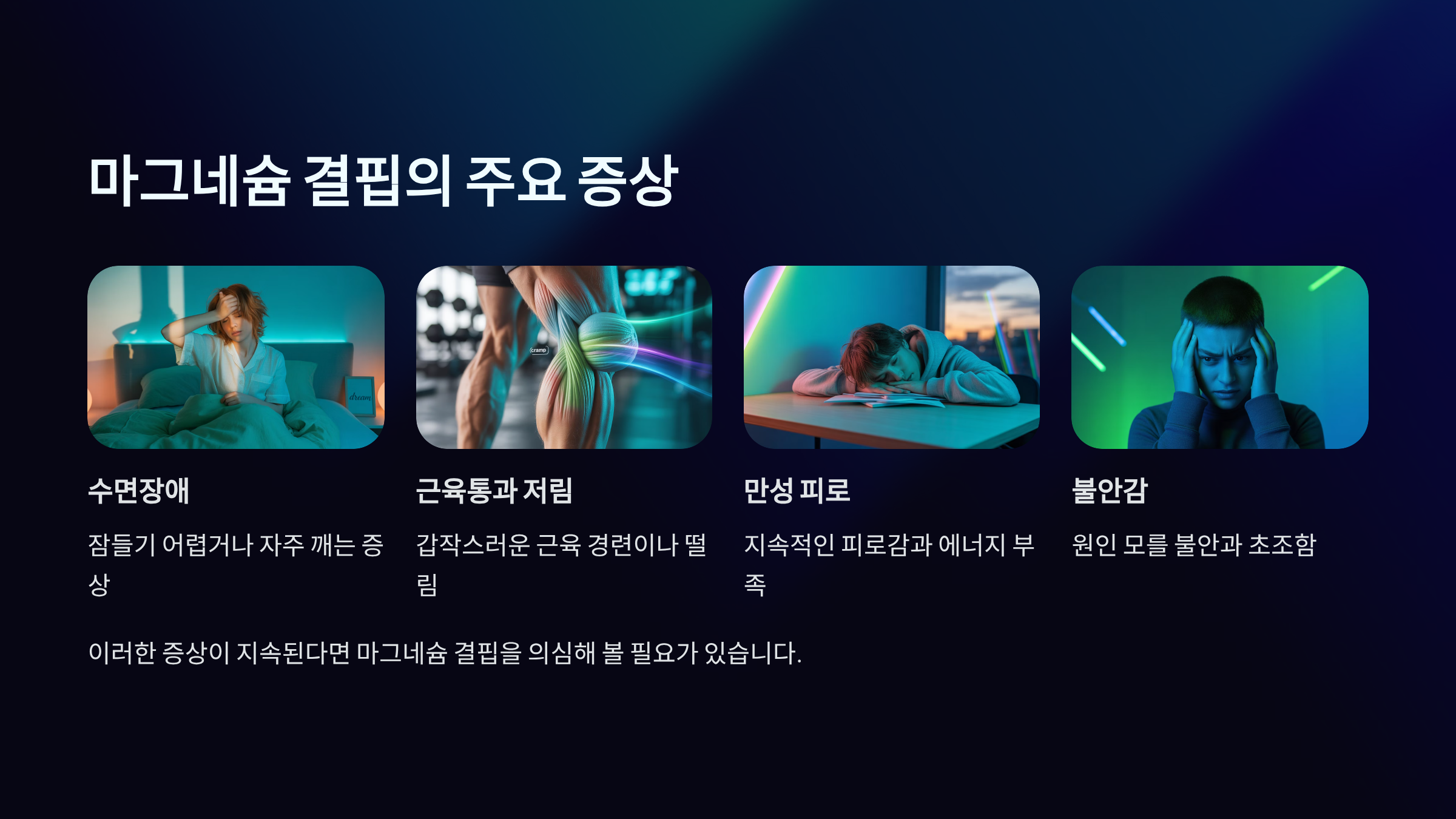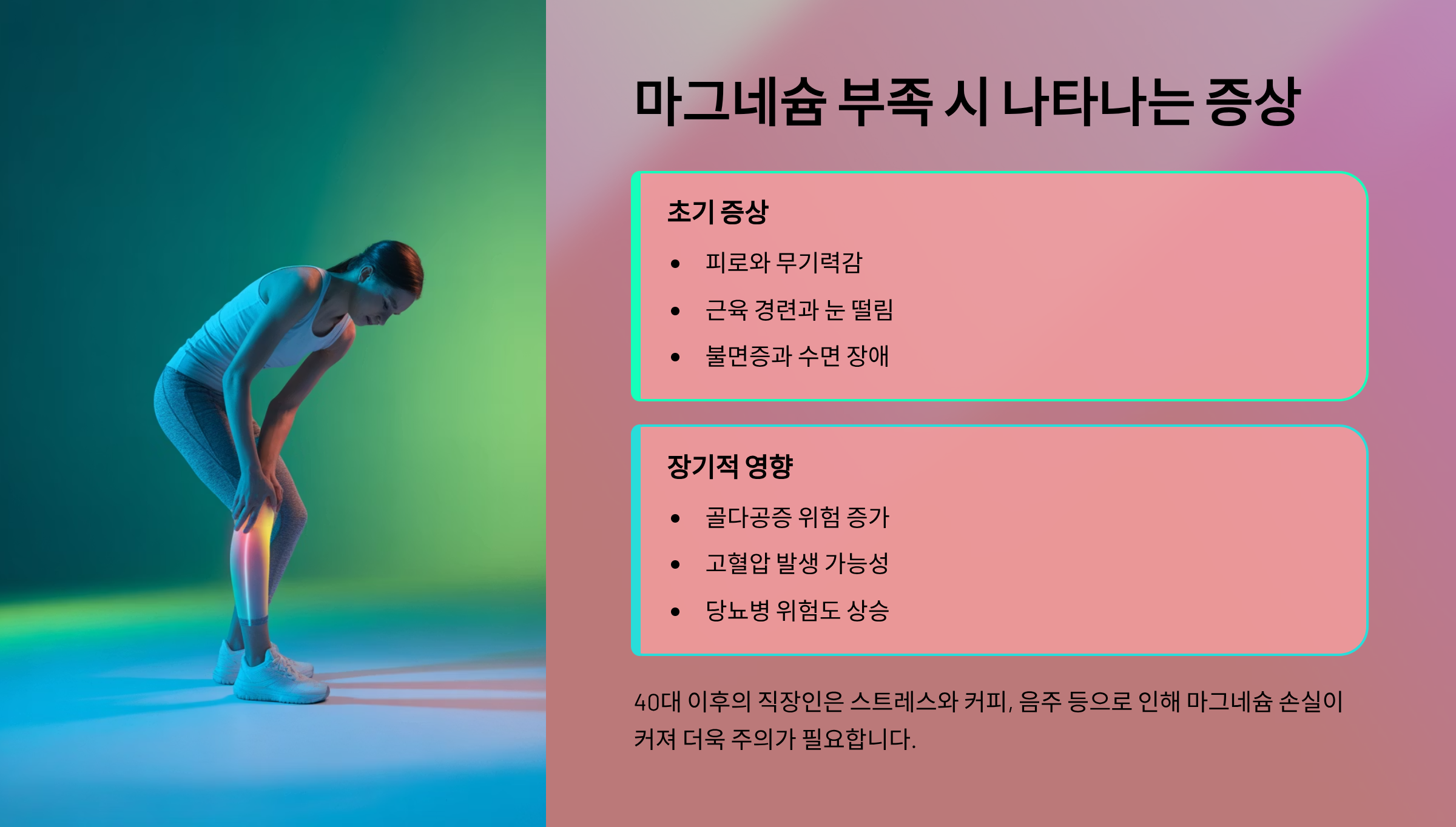 마그네슘이 부족하면 초기에는 피로, 불면, 근육 경련, 눈 떨림 등이 나타납니다. 장기적으로는 골다공증, 고혈압, 당뇨 등 만성 질환의 위험도 증가합니다. 40대 이후의 직장인은 스트레스와 커피, 음주 등으로 인해 마그네슘 손실이 커져 더욱 주의가 필요합니다.