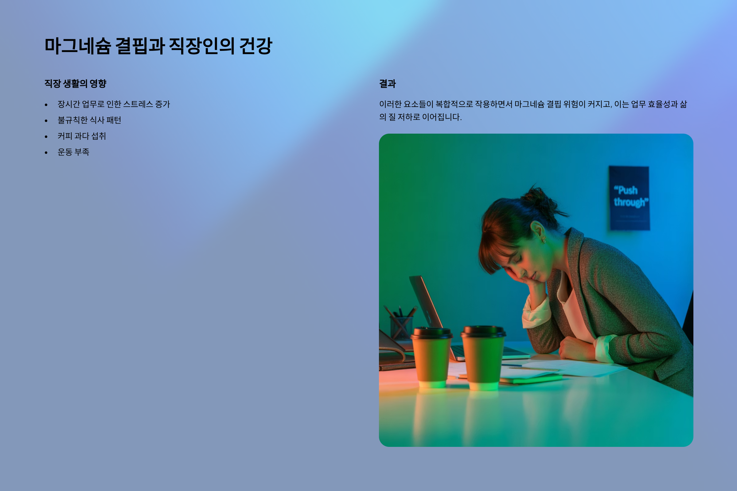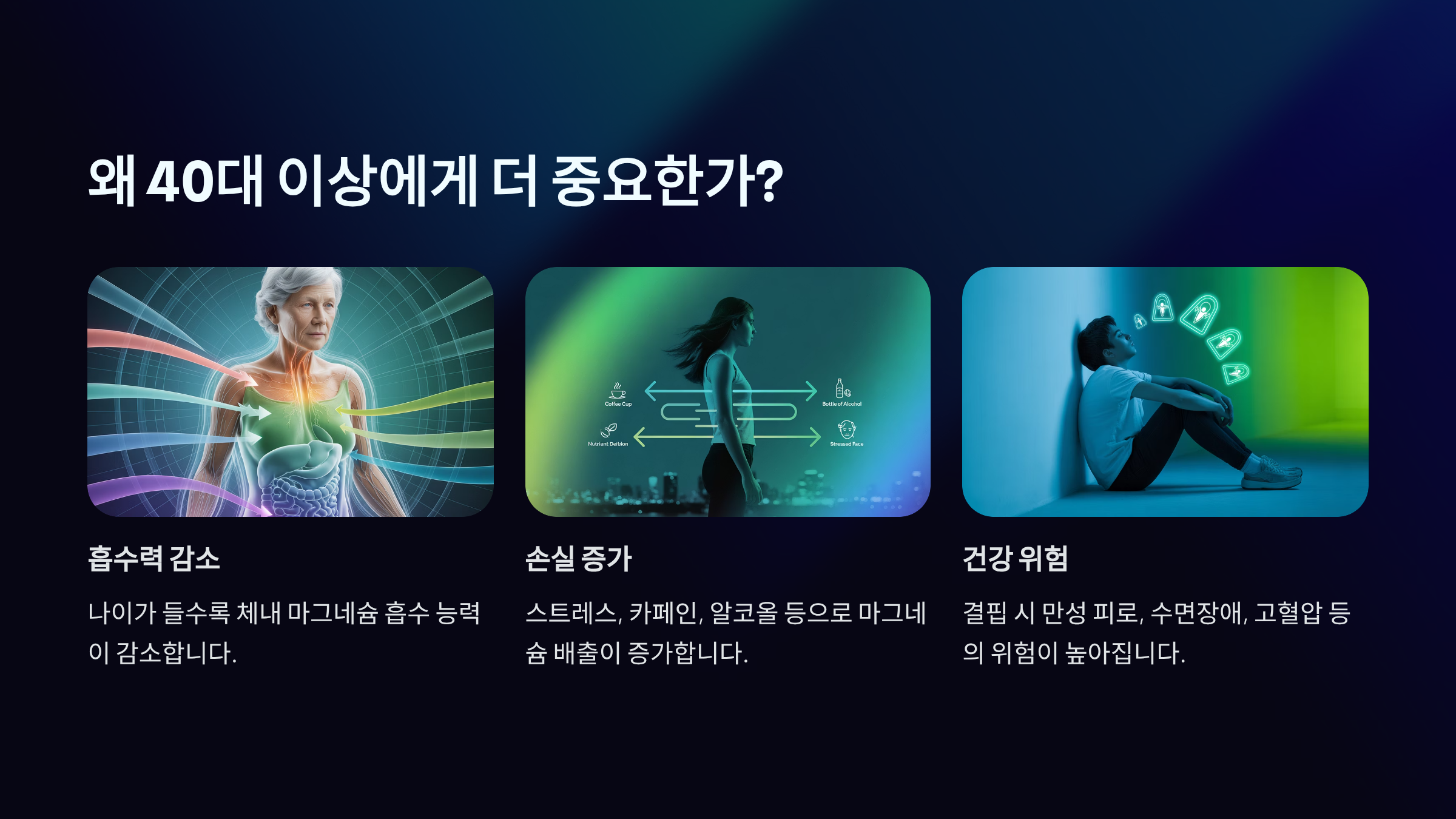 40대 이후에는 체내 흡수 능력이 감소하고, 마그네슘 손실은 증가합니다. 특히 직장 생활로 인한 스트레스, 불규칙한 식사, 운동 부족 등이 복합적으로 작용하면서 마그네슘 결핍 위험이 커집니다. 이는 만성 피로, 수면장애, 고혈압 등과 직결되므로 적극적인 관심이 필요합니다.