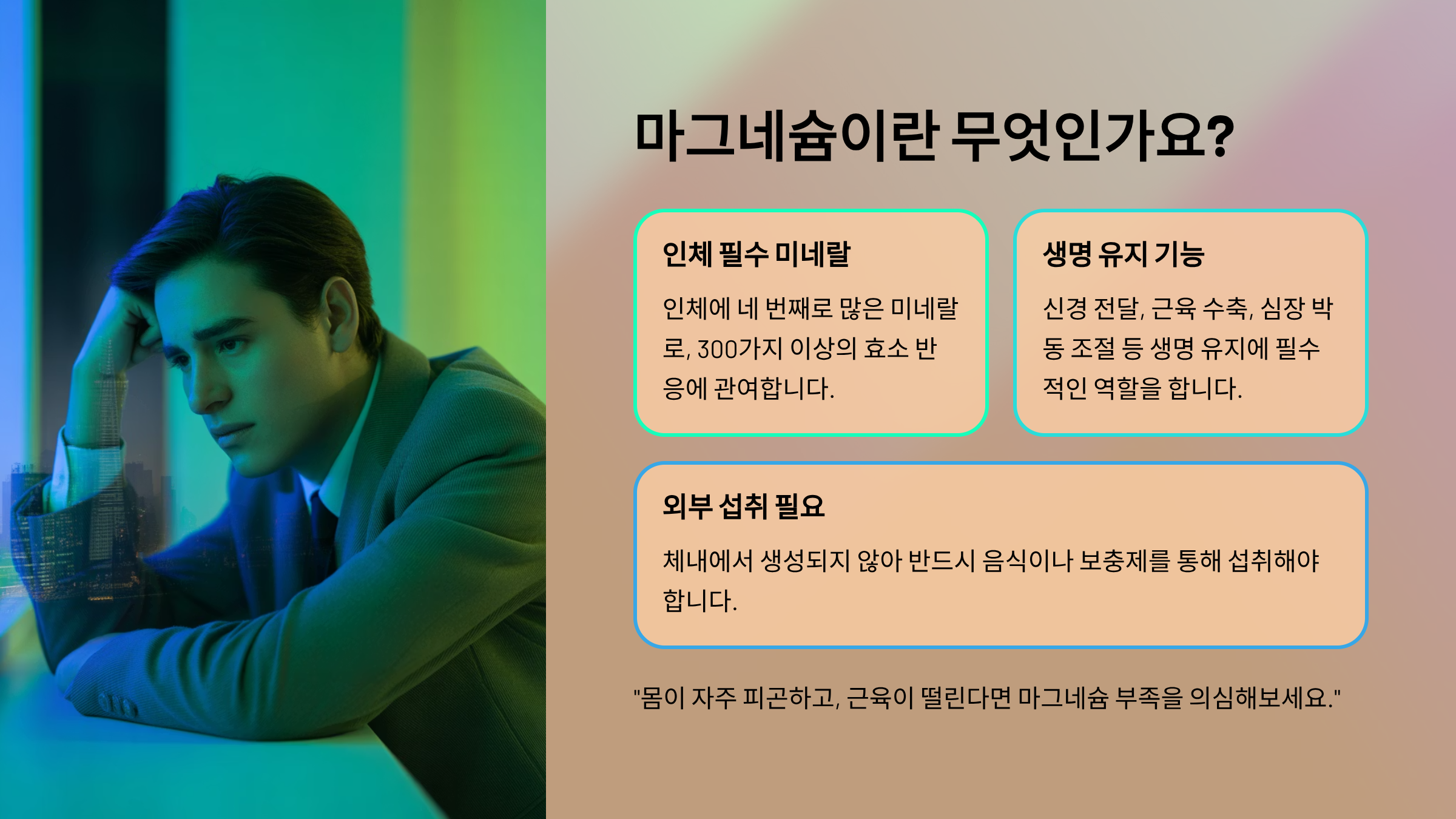 마그네슘은 인체에 네 번째로 많은 미네랄로, 300가지 이상의 효소 반응에 관여합니다. 신경 전달, 근육 수축, 심장 박동 조절 등 생명 유지에 필수적인 역할을 하며, 체내에서 생성되지 않아 반드시 음식이나 보충제를 통해 섭취해야 합니다.