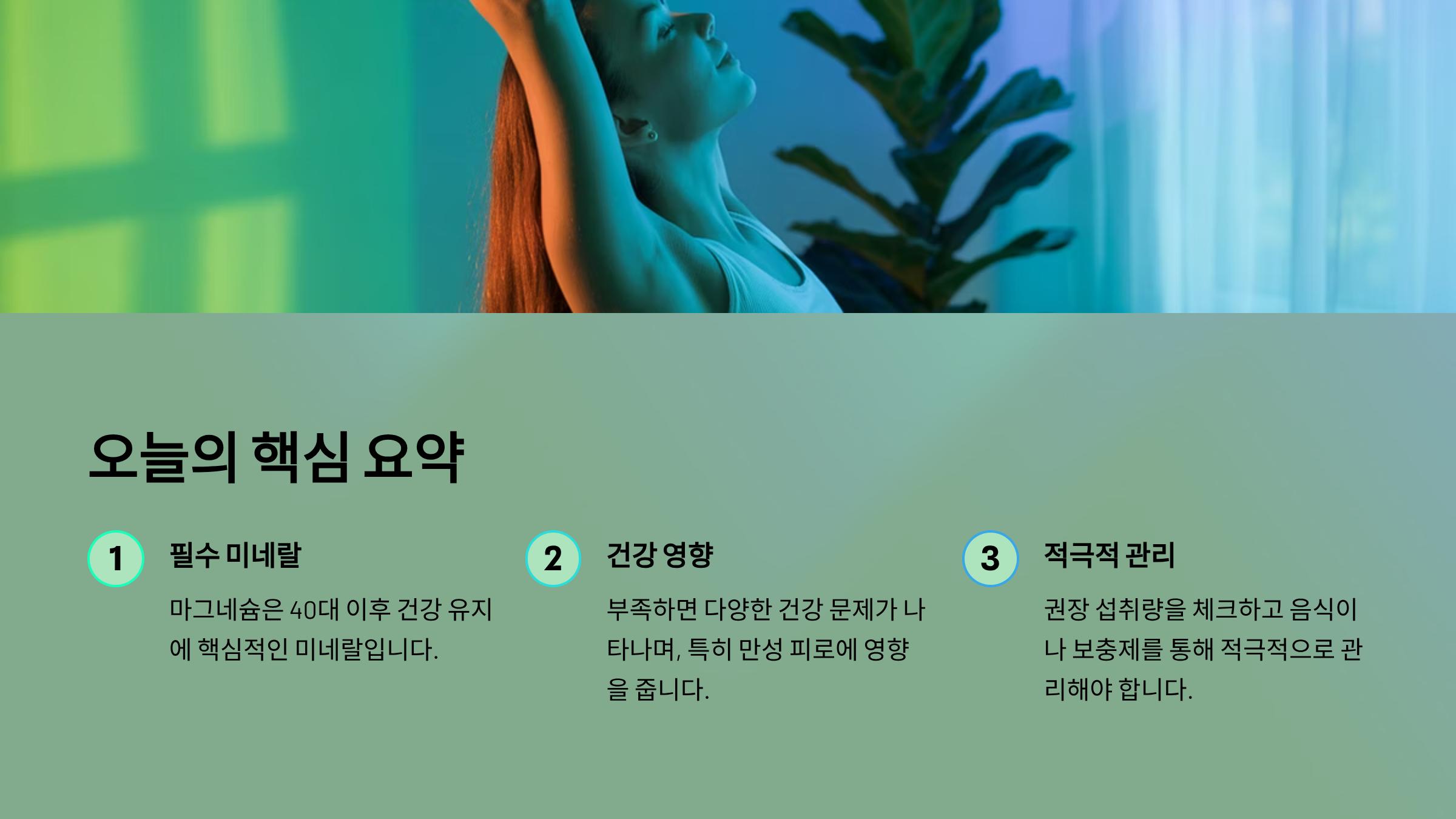 - 마그네슘은 40대 이후 건강 유지에 핵심적인 미네랄입니다.