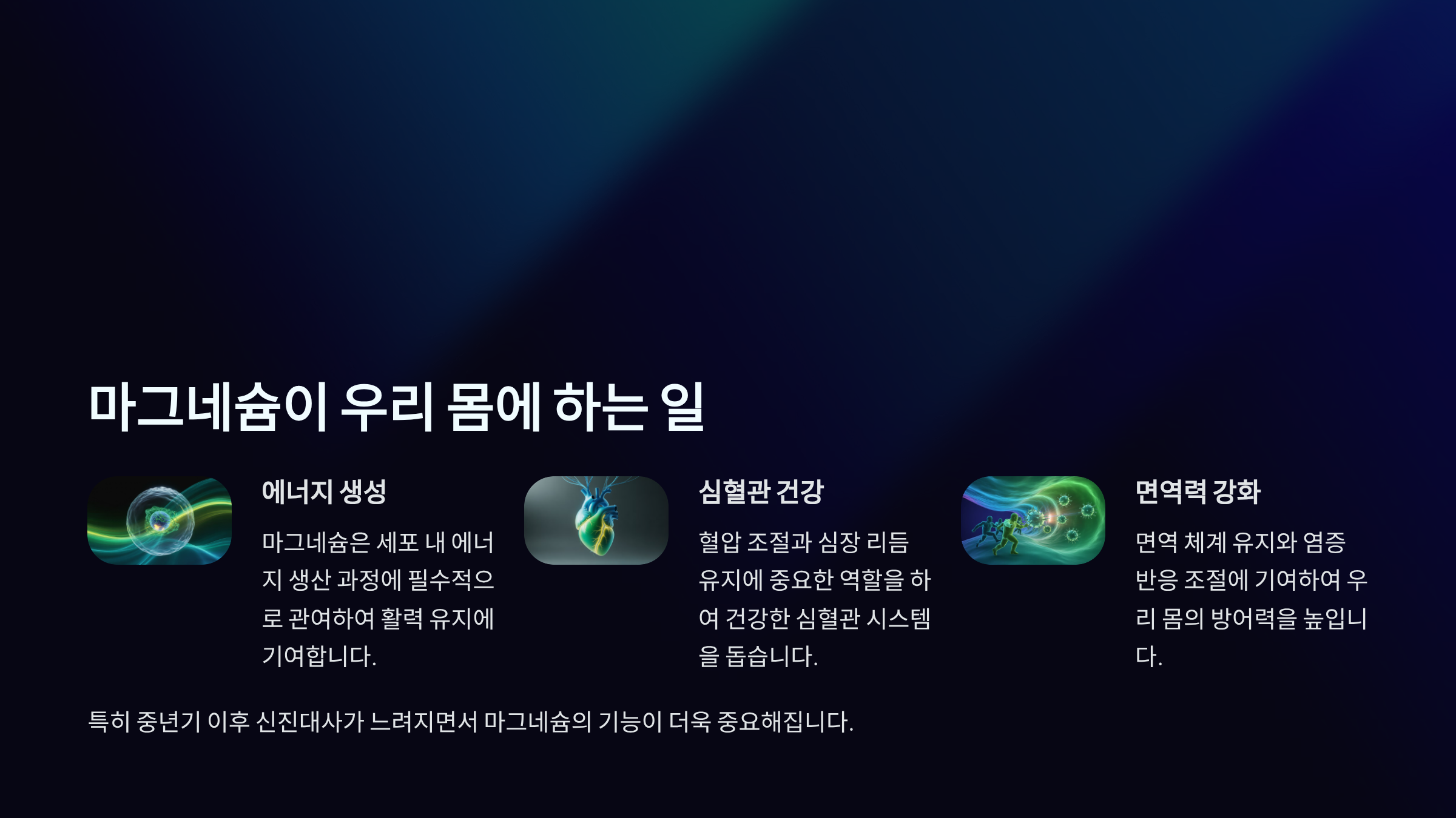 마그네슘은 에너지 생성, 단백질 합성, 혈당 및 혈압 조절 등 다양한 생리 기능에 핵심적인 역할을 합니다. 특히 중년기 이후 신진대사가 느려지면서 마그네슘의 기능이 더욱 중요해집니다. 면역력 유지와 심혈관 건강에도 직접적인 영향을 미칩니다.