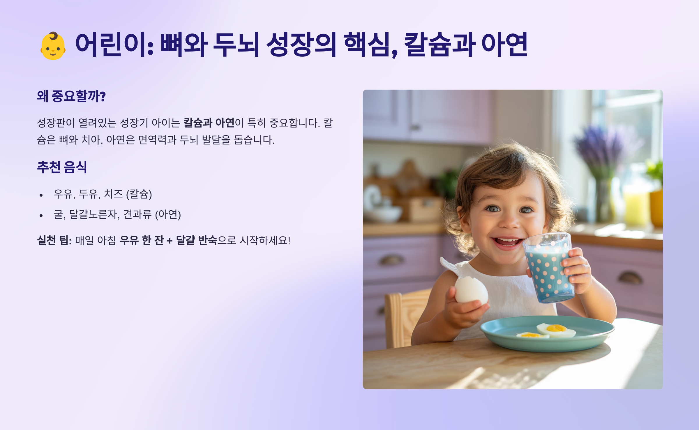 👶 1. 어린이: 뼈와 두뇌 성장의 핵심, 칼슘과 아연