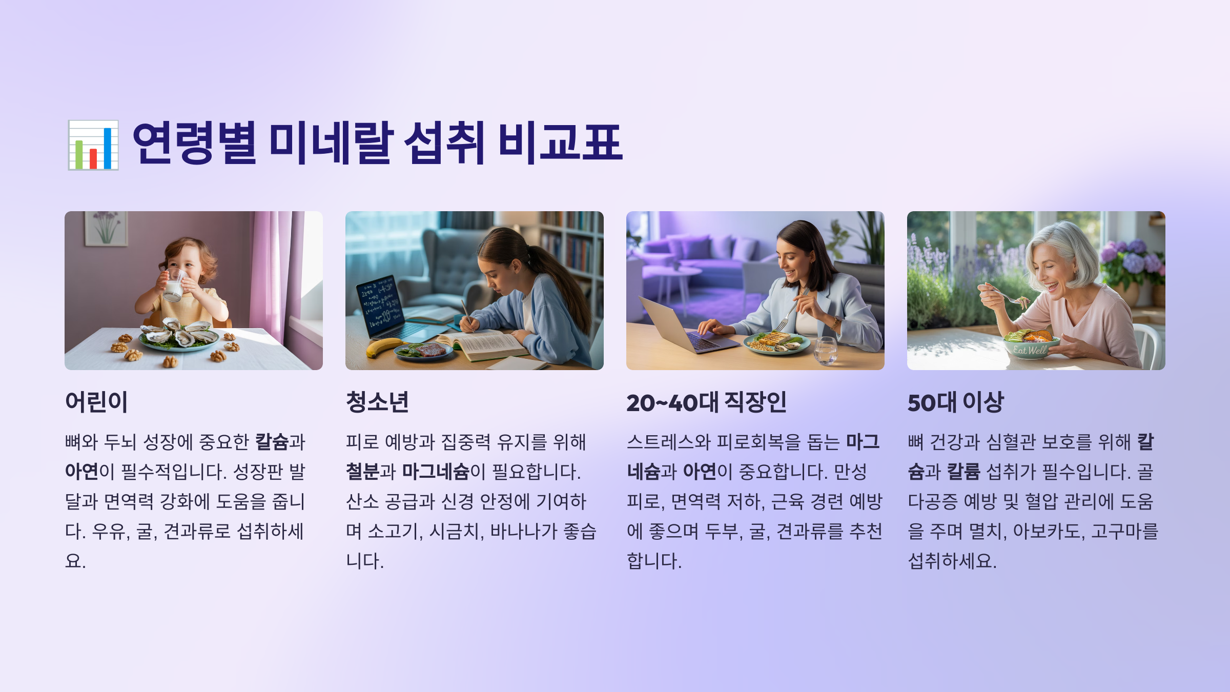 | 어린이 | 칼슘, 아연 | 성장판, 면역력 | 우유, 굴, 견과류 |