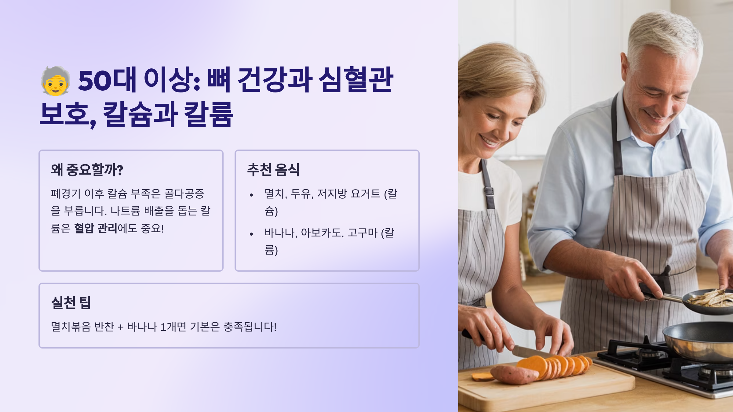 🧓 4. 50대 이상: 뼈 건강과 심혈관 보호, 칼슘과 칼륨