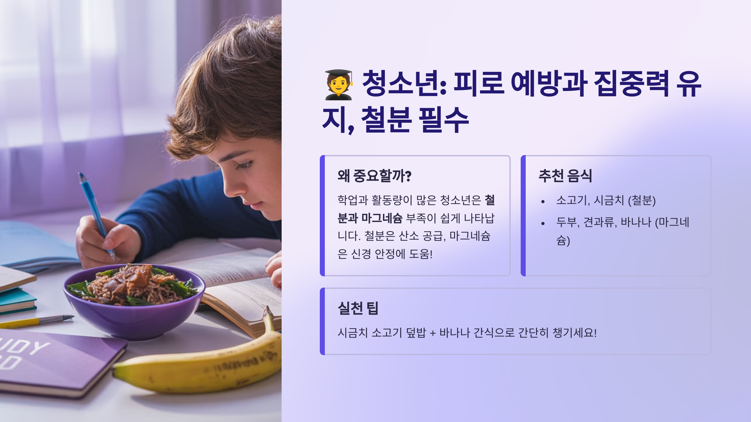 | 청소년 | 철분, 마그네슘 | 집중력, 피로 예방 | 소고기, 시금치, 바나나 |