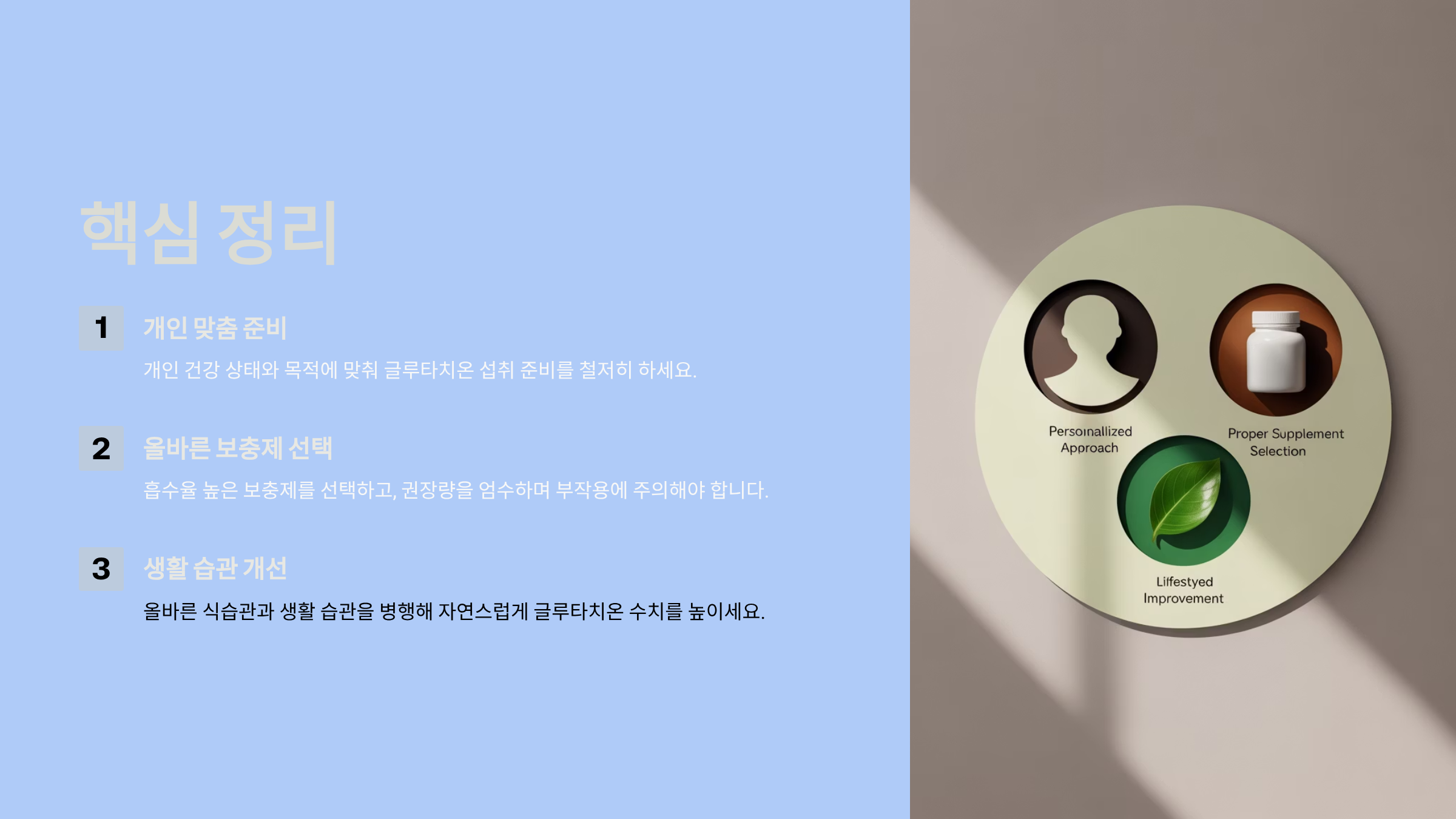 - 개인 건강 상태와 목적에 맞춰 글루타치온 섭취 준비를 철저히 하세요.