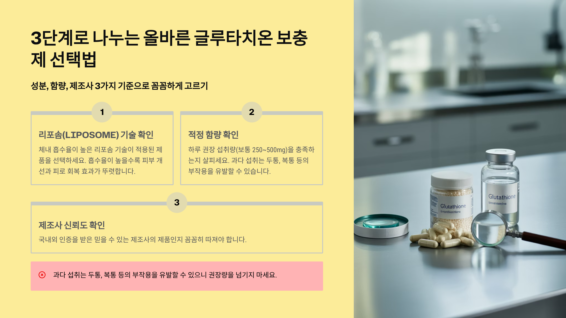 보충제를 고를 때는 1단계 ‘리포솜(liposome)’ 기술 적용 여부를 확인해 체내 흡수율이 높은 제품을 선택하세요. 2단계 하루 권장 섭취량(보통 250~500mg)을 충족하는지 살피고, 3단계 국내외 인증을 받은 믿을 수 있는 제조사의 제품인지 꼼꼼히 따져야 합니다. 제가 직접 구매 후 효과를 본 제품은 흡수율이 높아 피부 개선과 피로 해소 효과가 뚜렷했습니다.