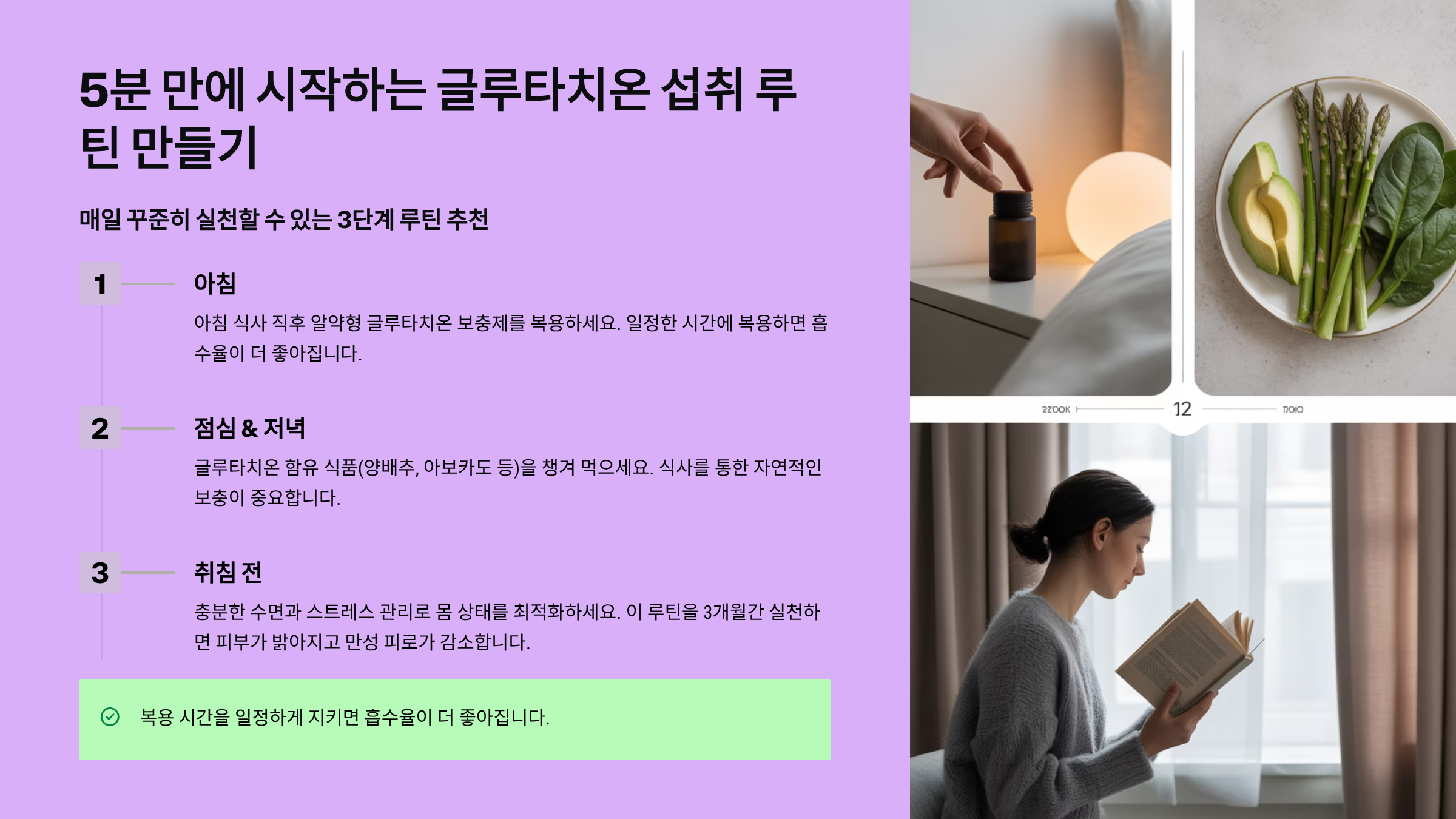 꾸준한 섭취가 가장 중요하므로 1단계 아침 식사 직후 알약형 글루타치온 보충제를 복용하고, 2단계 점심과 저녁에는 글루타치온 함유 식품(양배추, 아보카도 등)을 챙겨 먹으며, 3단계 저녁에는 충분한 수면과 스트레스 관리로 몸 상태를 최적화하세요. 제가 직접 이 루틴을 3개월간 실천하며 피부가 밝아지고 만성 피로가 감소한 것을 느꼈습니다.