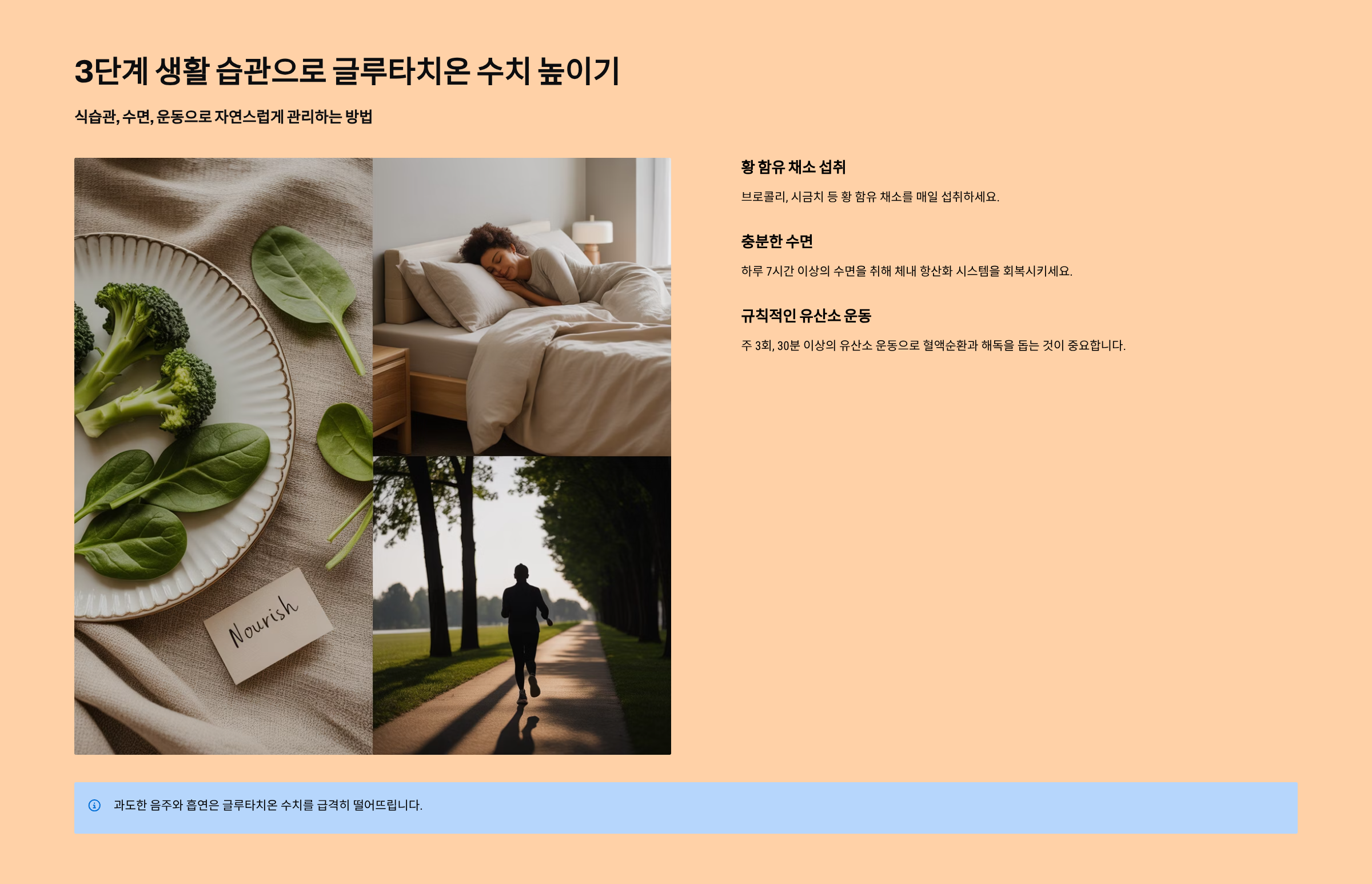 글루타치온 수치를 자연스럽게 올리려면 1단계 브로콜리, 시금치 등 황 함유 채소를 매일 섭취하세요. 2단계 충분한 수면(하루 7시간 이상)을 취해 체내 항산화 시스템을 회복시키고, 3단계 규칙적인 유산소 운동(주 3회, 30분 이상)으로 혈액순환과 해독을 돕는 것이 중요합니다. 제가 직접 생활 습관을 바꾼 후 글루타치온 수치가 눈에 띄게 좋아진 경험이 있습니다.
